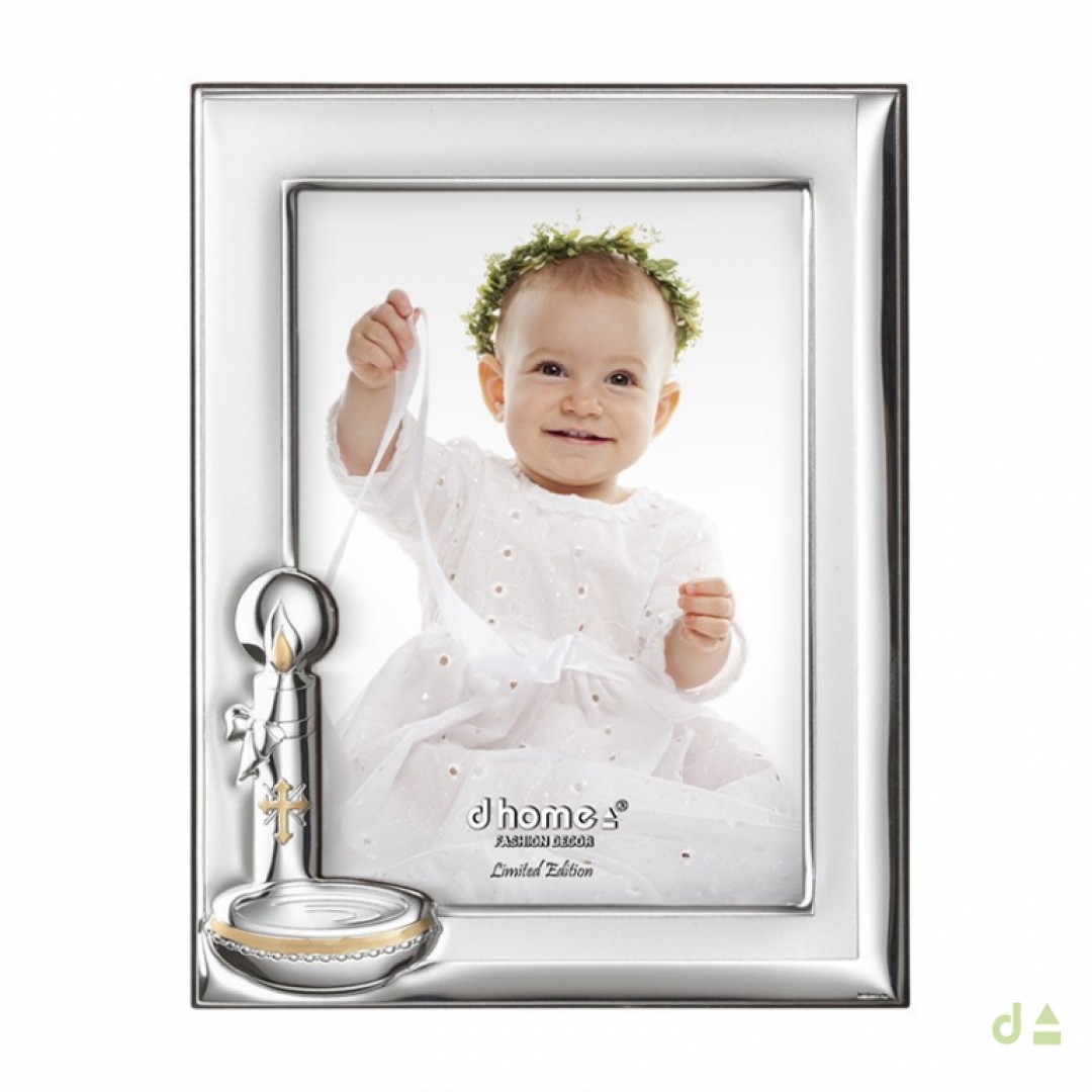 Moldura DHOME em PVD prateado alusiva ao batismo, com apontamentos de dourado.