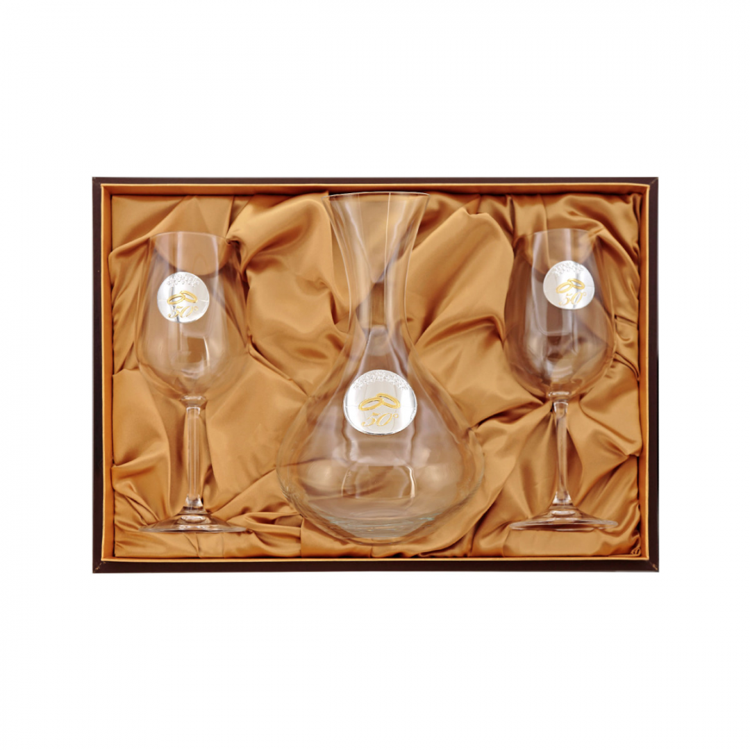 Conjunto de decanter e 2 copos em cristal, com placa prata bilaminada alusiva aos 50 anos de casamento.