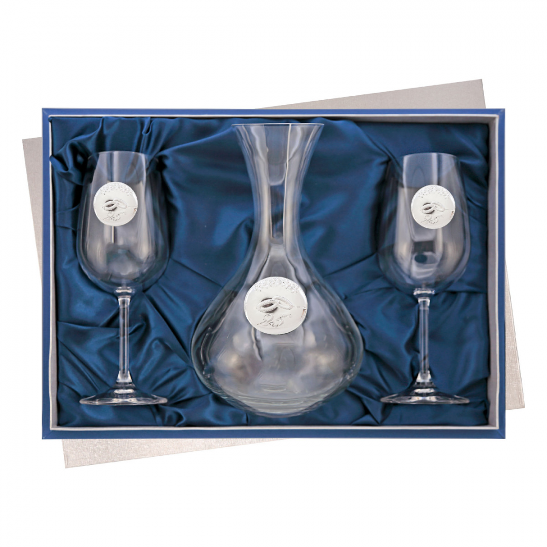 Conjunto de decanter e 2 copos em cristal, com placa prata bilaminada alusiva aos 25 anos de casamento.