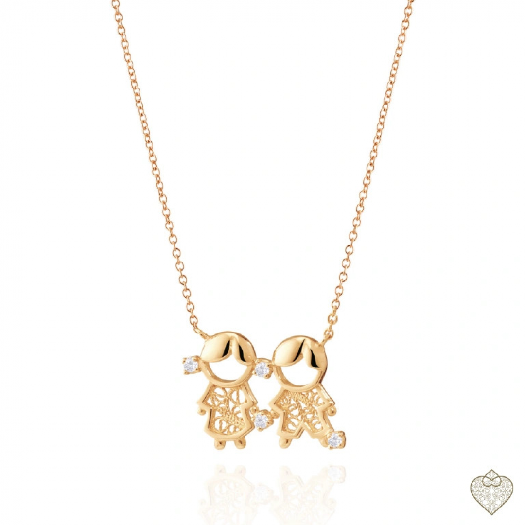 Colar SAUDADE menina e menino, em filigrana, o característico padrão faz com que esta se destaque, tornando-a na escolha perfeita para quem deseja algo único e elegante. A Saudade Jewels é uma marca portuguesa de joias que homenageia a filigrana portuguesa. Cada joia é uma obra de arte que transmite elegância em qualquer ocasião. Presentes elegantes e intemporais com sofisticação.