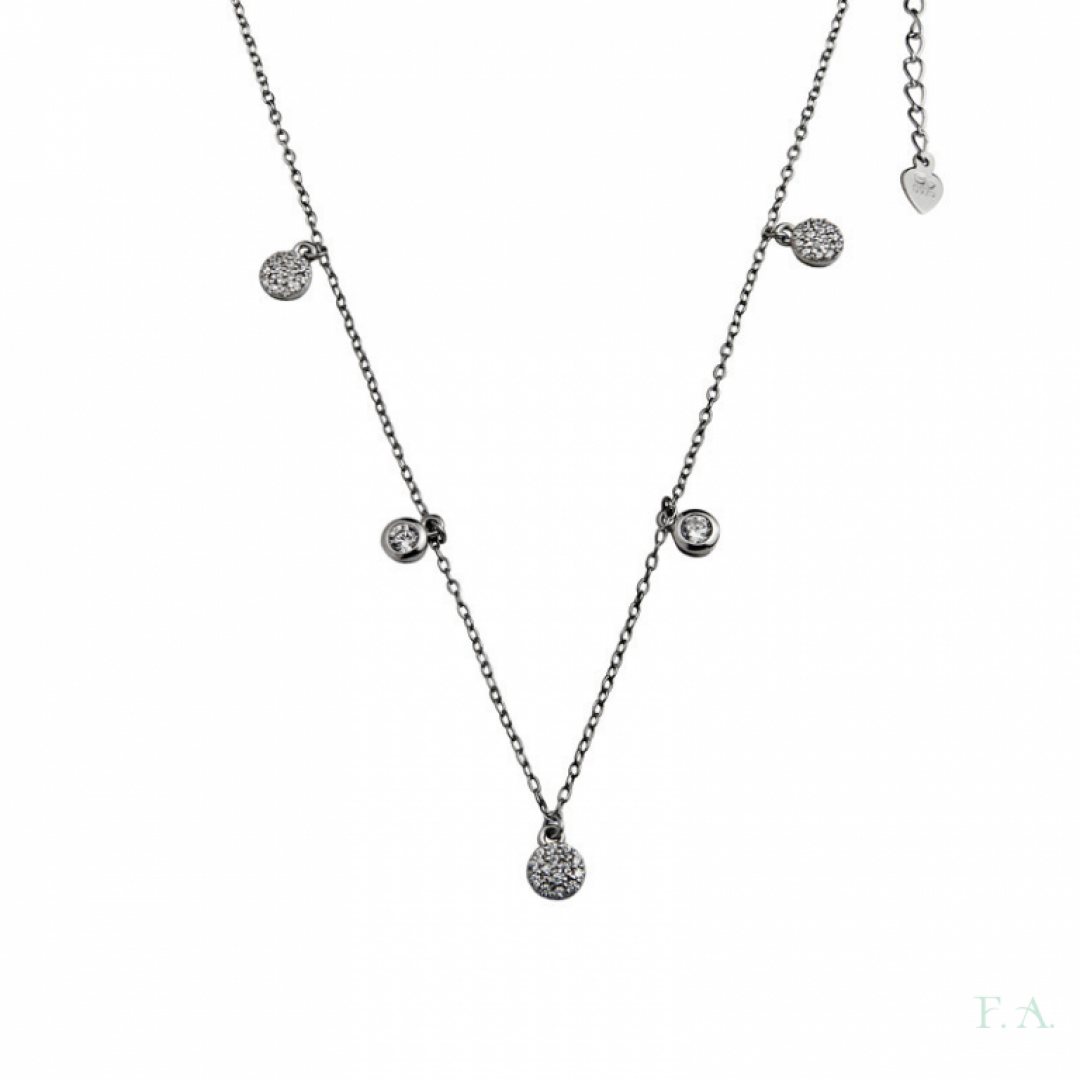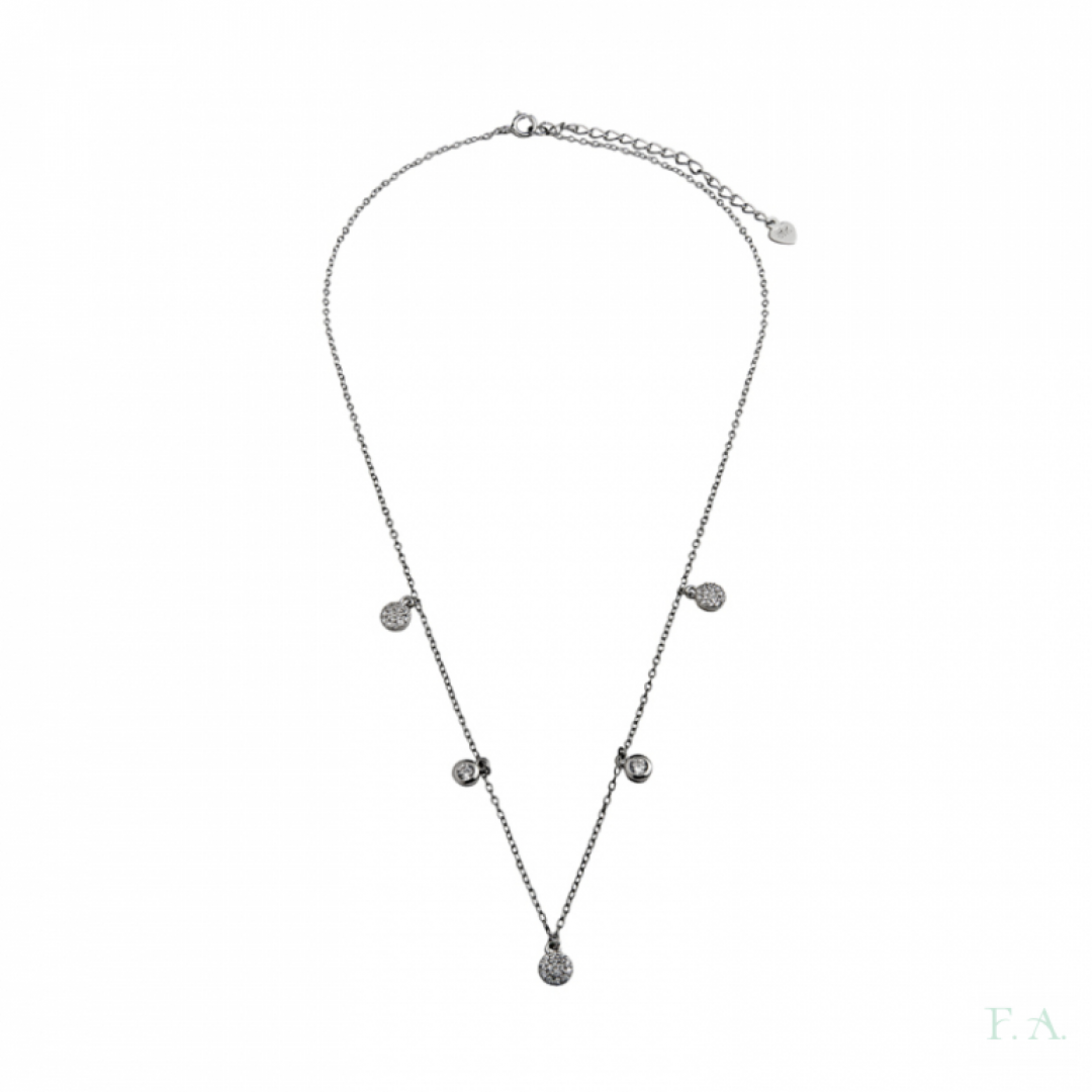 Colar em prata com zircónias e circulos pendentes, é uma joia versátil e cheia de vida. Um apontamento de elegância para o teu look.