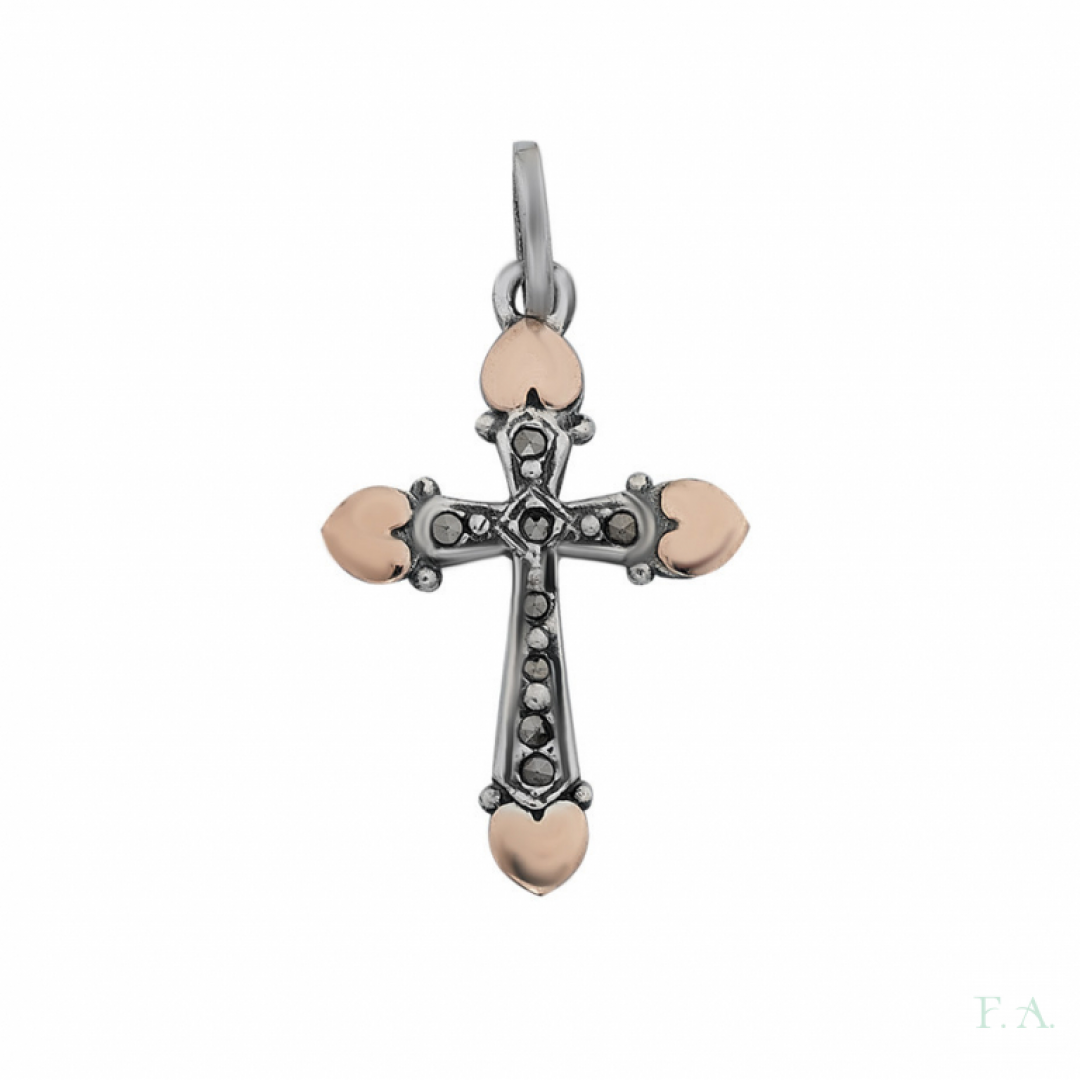 Cruz em prata de lei 925‰ , ouro 9k e marcassites. As joias de Marcassites popularizaram-se em Portugal no início século XX como réplicas em prata de peças tradicionais da joalharia portuguesa do século XVIII. Agora são trazidas para a modernidade enquanto celebração de um amor à moda antiga - um romance como o dos nossos avós, cujas confissões de amor se perpetuam no tempo.
