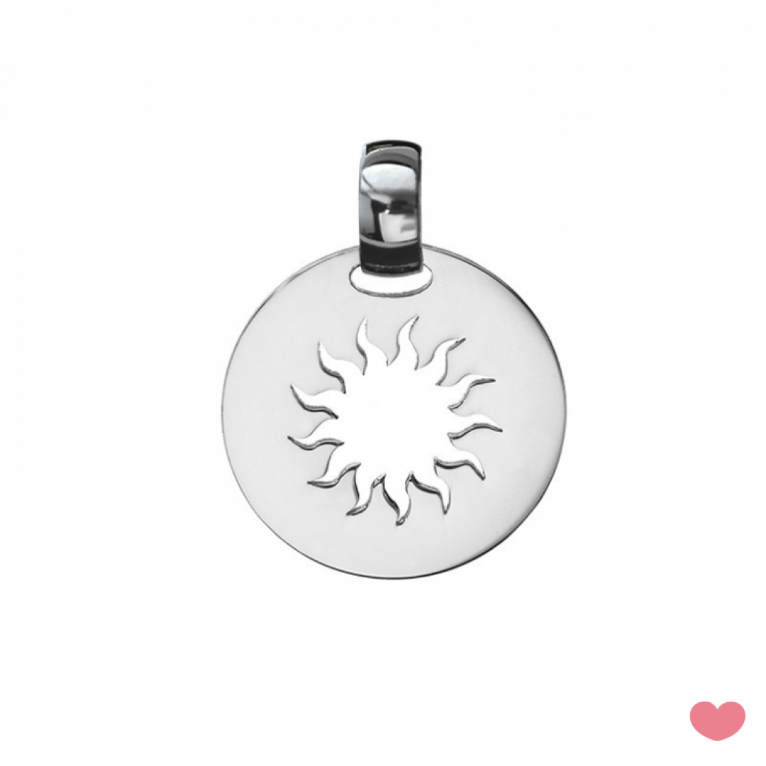 Medalha PASSION Sol em prata com banho de ródio, tem 2cm de diâmetro é o ideal para usar em fios.