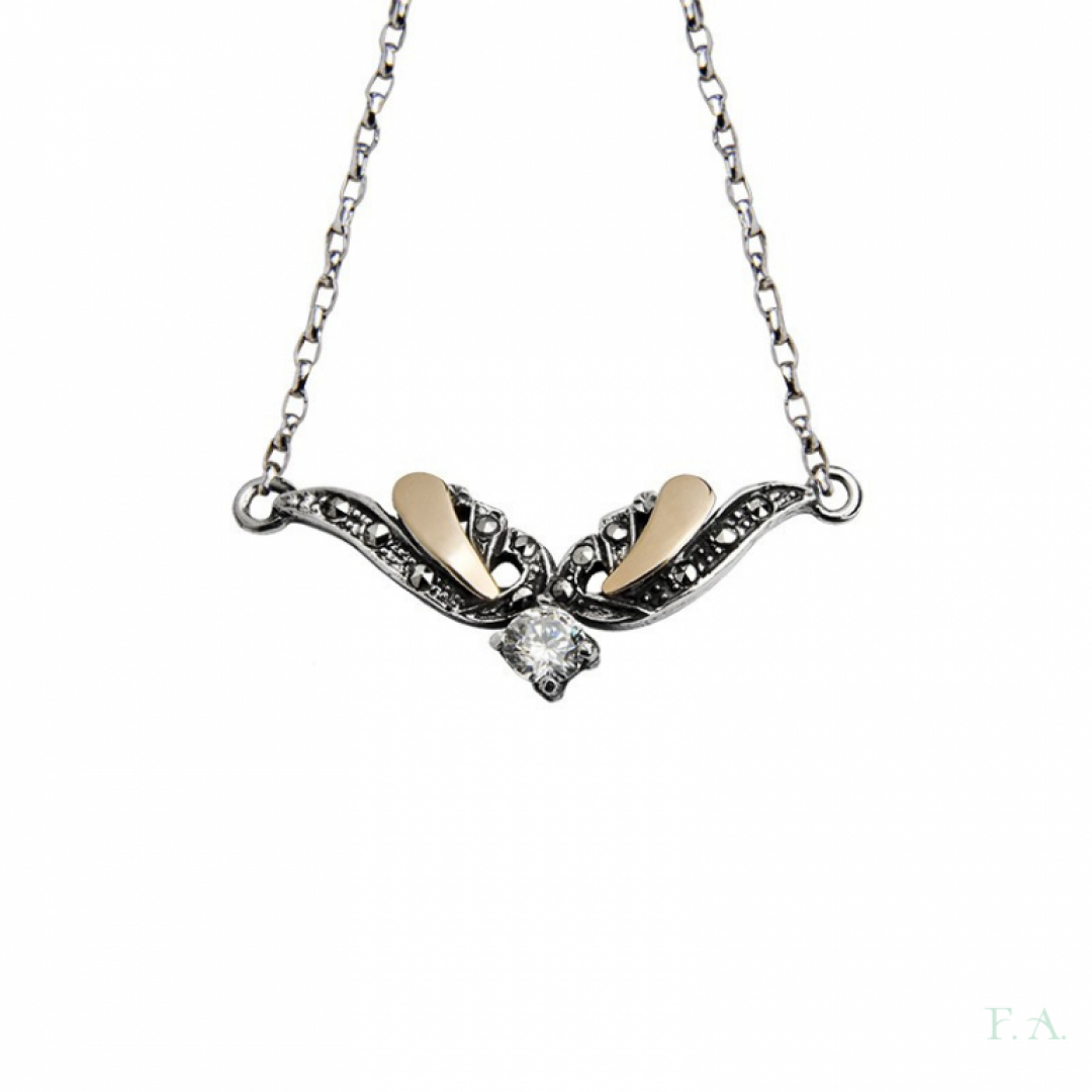 Colar em prata e ouro 9k com marcassites. As joias de Marcassites popularizaram-se em Portugal no início século XX como réplicas em prata de peças tradicionais da joalharia portuguesa do século XVIII, criadas em ouro e cravadas com diamantes e rosas. O nome Marcassites vem da pedra natural presente nestas joias. Dimensões 3.4x1.1cm