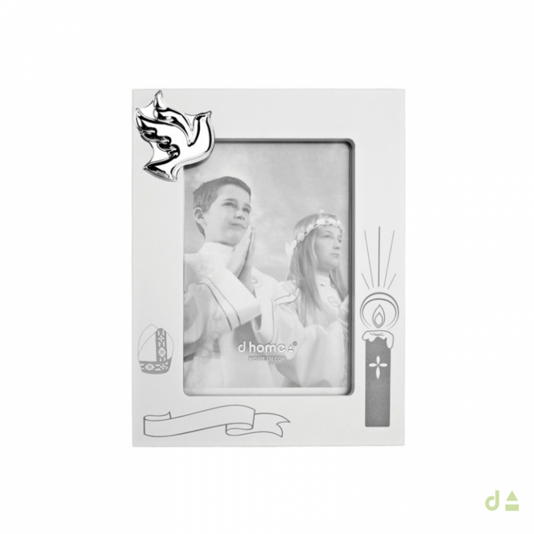 Moldura Dhome, em madeira branca com pomba em prata bilaminada, alusiva ao Crismã. Acrescente valor sentimental e guarde para sempre junto com as melhores memórias. A prenda perfeita para os momentos mais marcantes da vida.