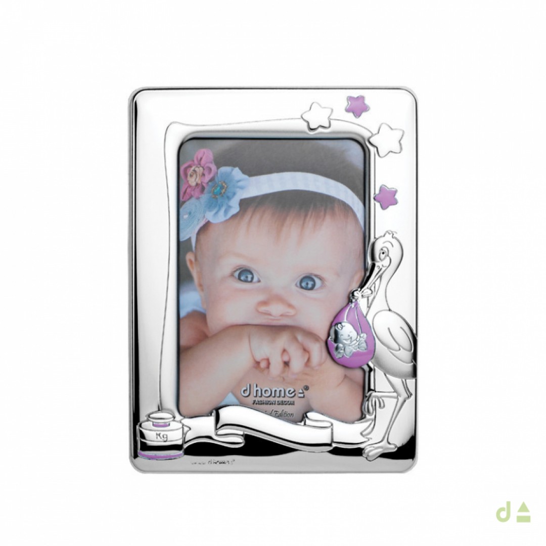 Moldura DHOME em PVD prateado, com cegonha alusiva ao nascimento.
