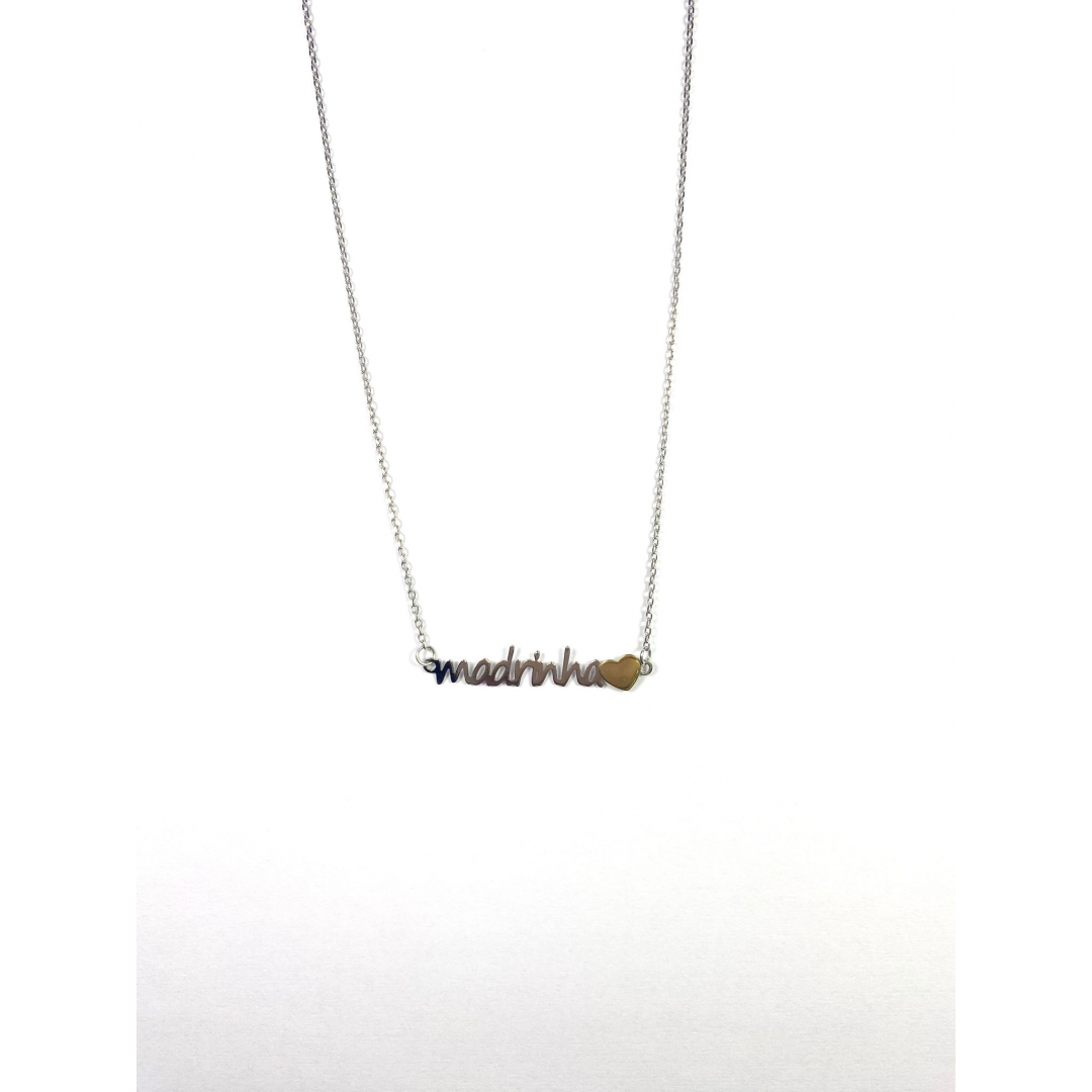 Colar em prata de lei com gravação Madrinha e coração dourado.