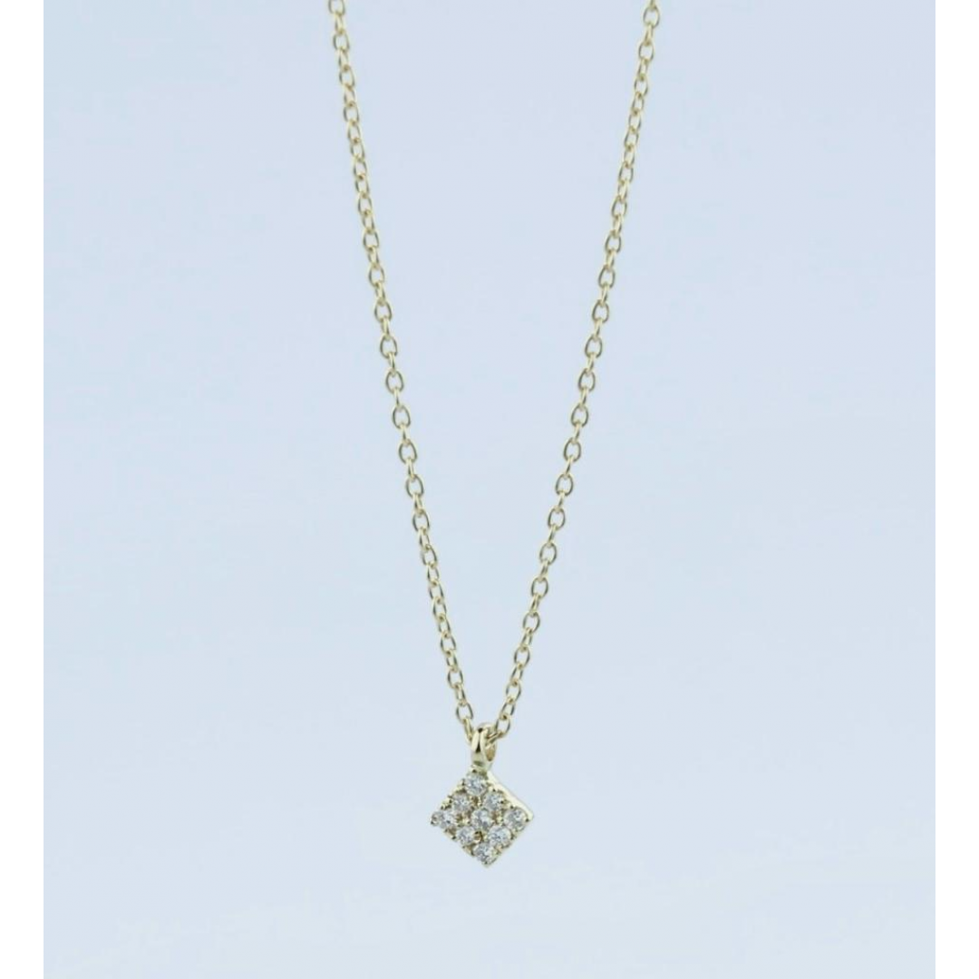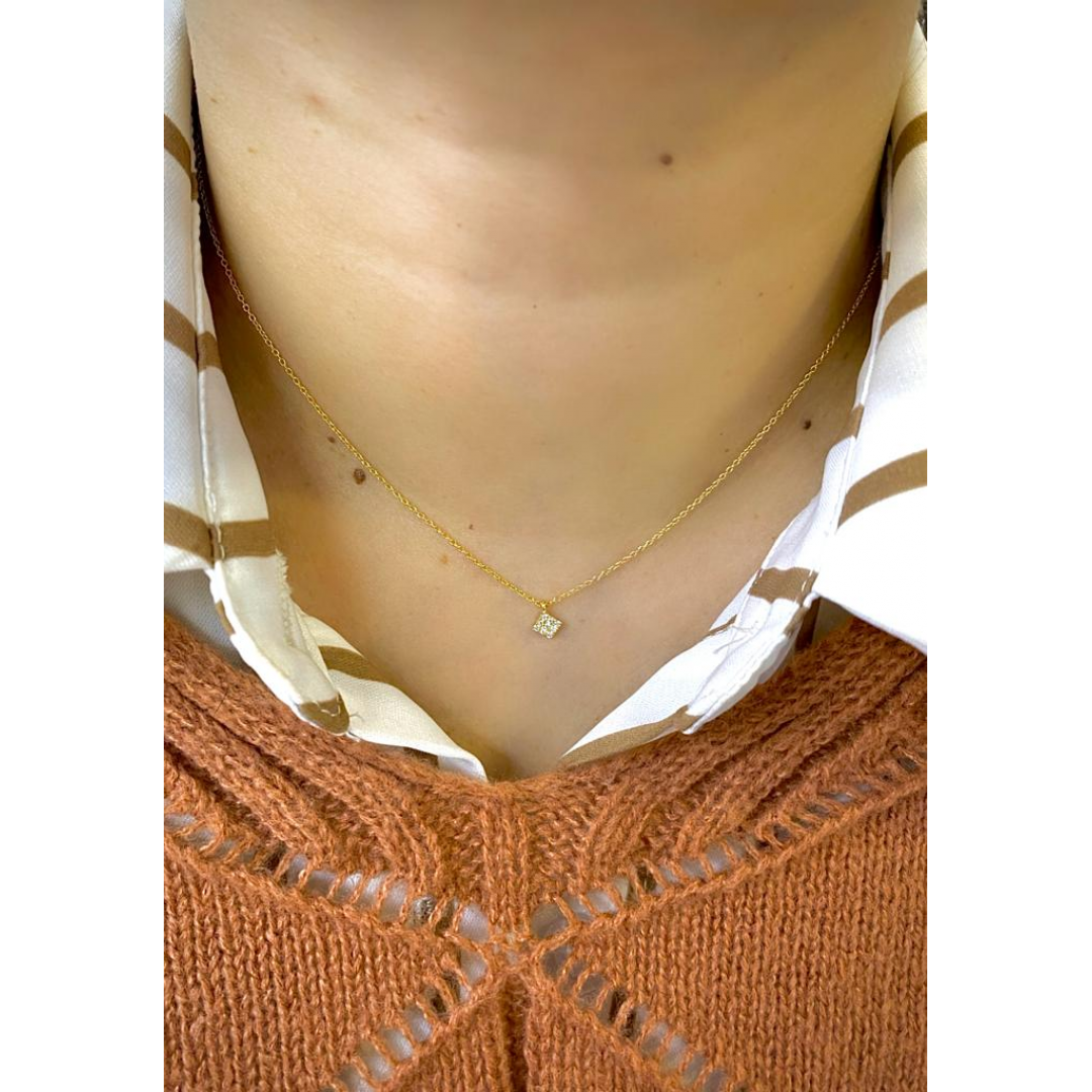 Colar em ouro 19k com 9 diamantes. Este colar apresenta uma simplicidade e elegância únicas, é o elemento ideal para completar e dar brilho ao seu look.