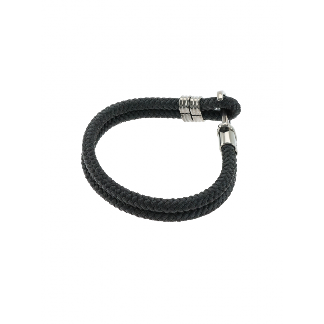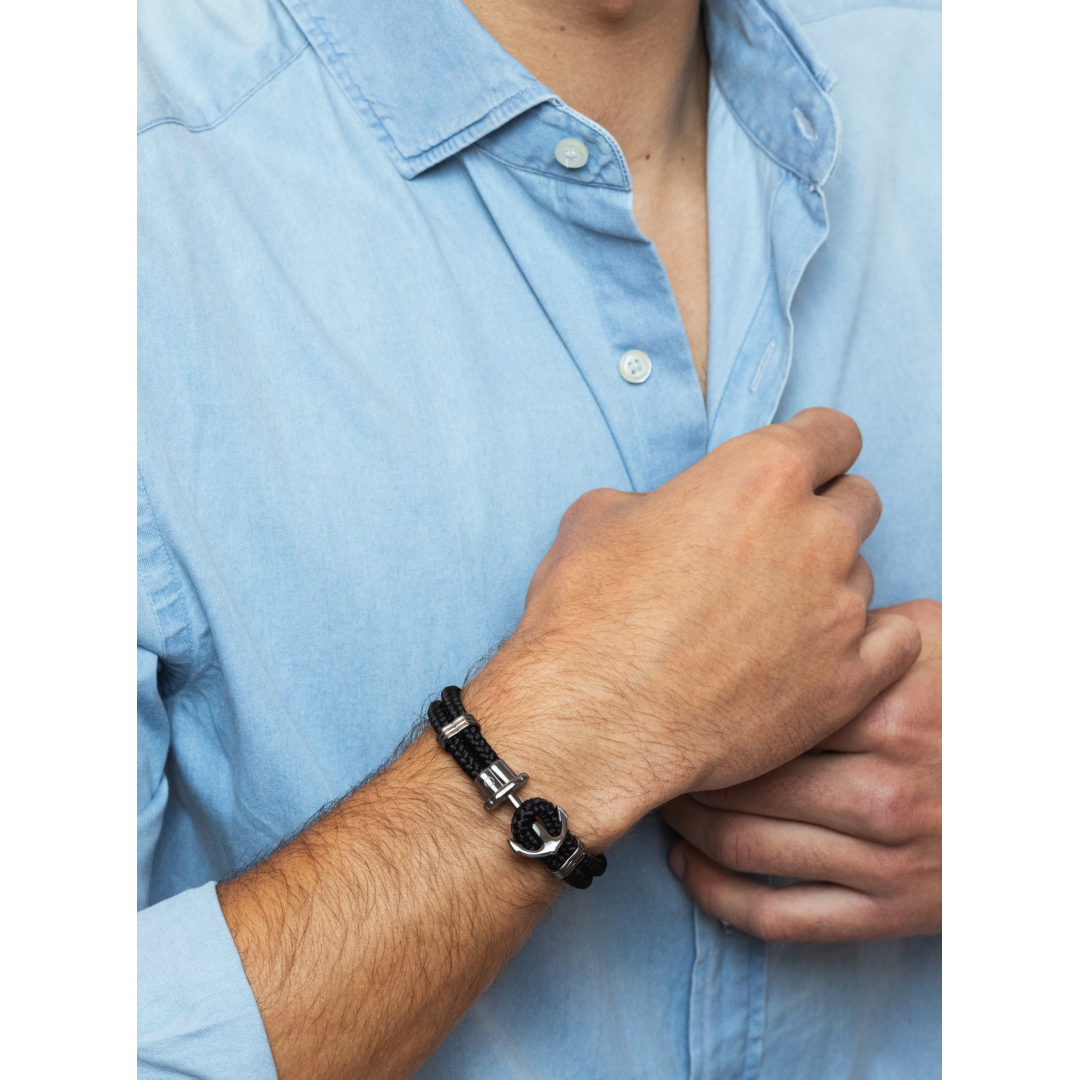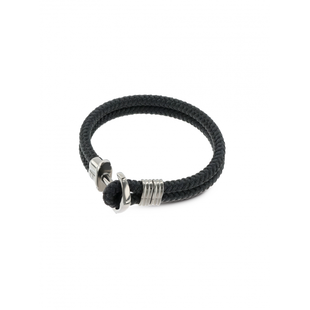 A pulseira Mountain preta da coleção One Men é inspirada e tem como principal destaque uma âncora. É composta por duas tiras de corda pretas de espessura média que terminam com uma âncora em aço inoxidável a servir de gancho para fechar a pulseira - a terminação de de uma das extremidades 'enlaça' na âncora fechando assim a pulseira, dando realce ao fecho da pulseira ao invés de outras da coleção. Um acessório com um estilo mais descontraído e aventureiro, ideal para combinar com looks mais casuais ou desportivos.