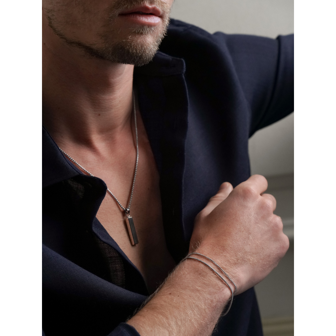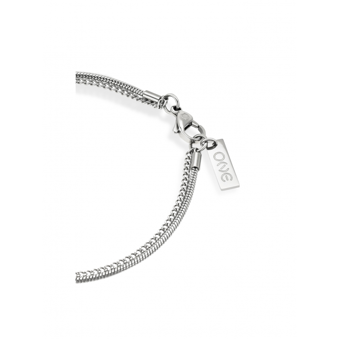 A pulseira Trace da coleção One Men em aço inoxidável é um acessório masculino subtil e discreto. A pulseira é composta por dois tipos de malha bem fina, uma prateada em snake e outra com a mais composta malha cubana, também em prateado. É uma pulseira base perfeita para combinar com outros acessórios de homem como pulseiras ou relógios One. A pulseirta termina com um fecho em mosquetão e conta ainda com uma pequena placa rectangular com o logo da One.