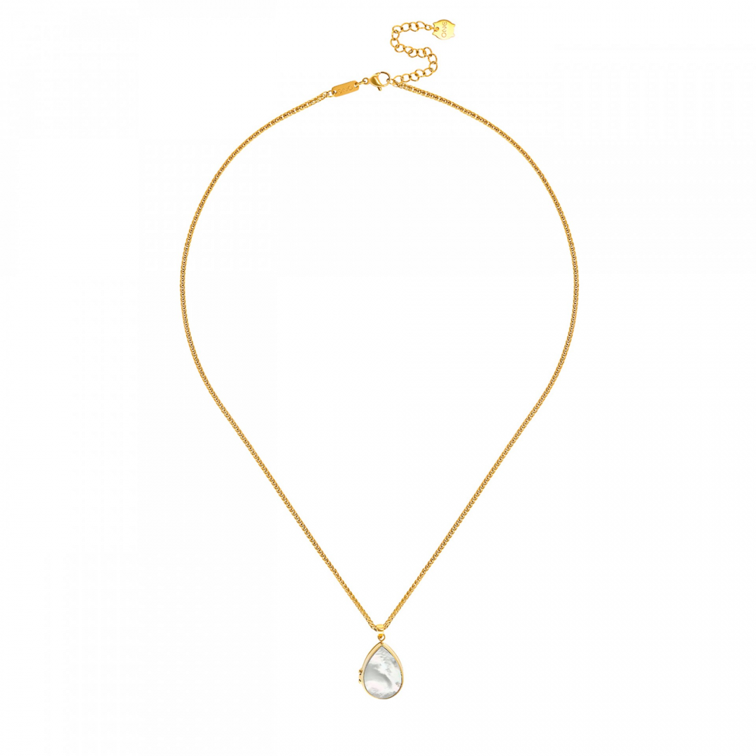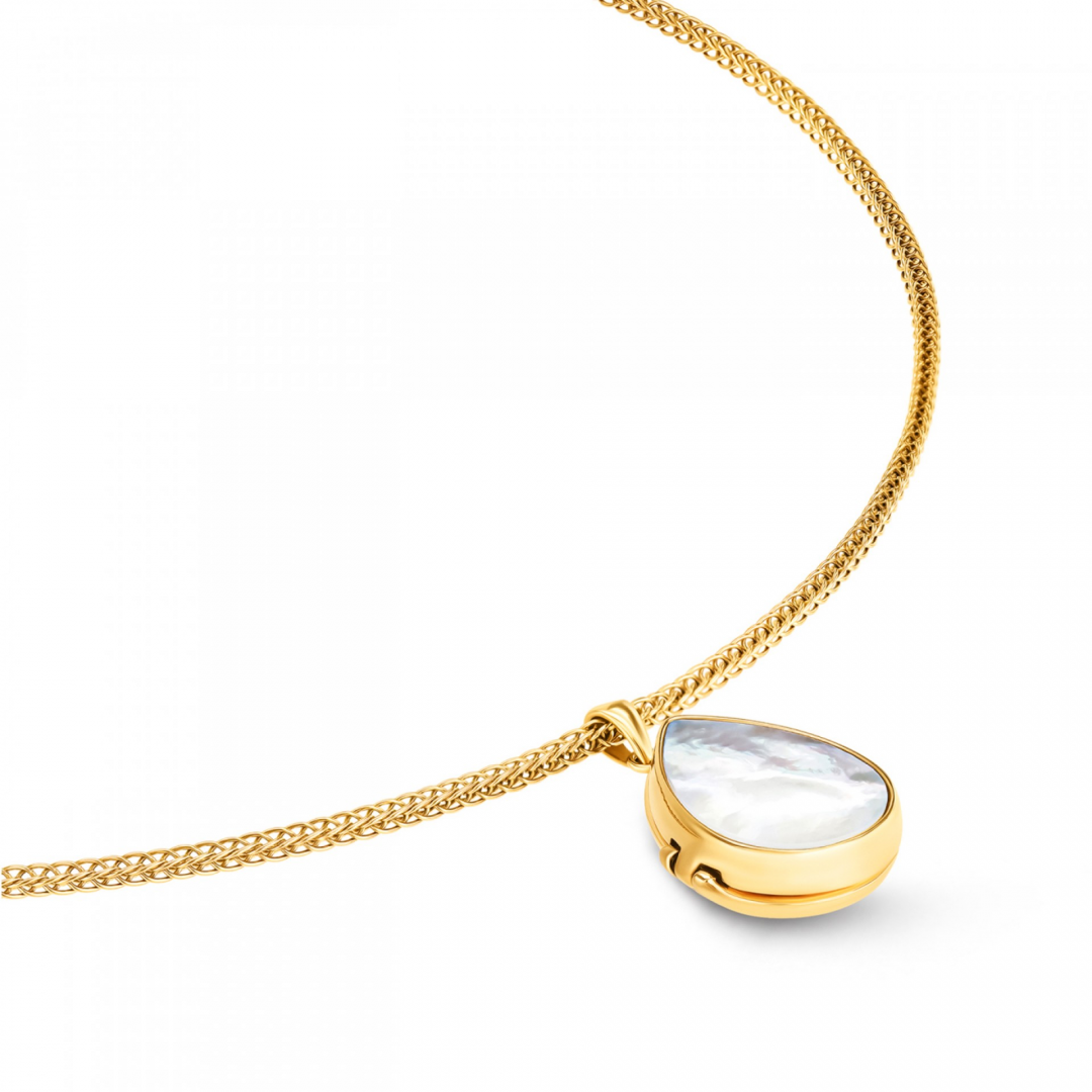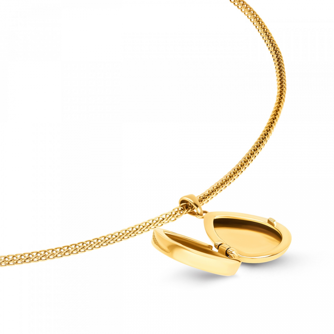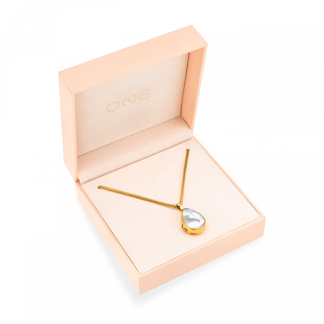 O colar relicário Pearl Memories combina delicadeza e significado num design intemporal em tom dourado. O destaque vai para o pendente em formato de gota, com acabamento em madrepérola na parte frontal, que lhe confere um brilho suave e elegante. O pendente abre-se, revelando um pequeno relicário no interior, pensado para guardar uma fotografia ou memória especial junto ao coração. Este detalhe transforma a peça num acessório não só estético, mas também emocional, carregado de significado pessoal. A malha delicada equilibra o protagonismo do pendente, garantindo conforto no uso diário. O colar inclui ainda um extensor, permitindo ajustar o comprimento conforme o estilo ou o decote. Uma peça discreta, mas com intenção, perfeita para usar todos os dias ou oferecer com um significado especial. Ideal para quem valoriza joias com memória, simbolismo e um toque clássico e feminino.