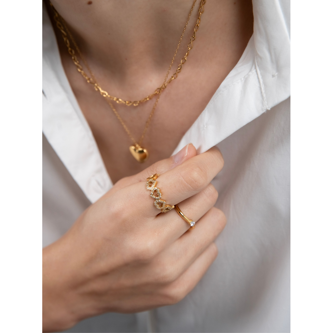 O anel Heart da coleção Reflexions destaca-se pelo seu design em forma de coração em torno de todo o anel. Além do estilo mais romântico, o anel tem um toque extra de luz graças aos cristais zircónias brancas cravados em toda a peça. Um anel muito femino que pode ser conjugado com outros anéis ONE ou utilizado de forma individual.