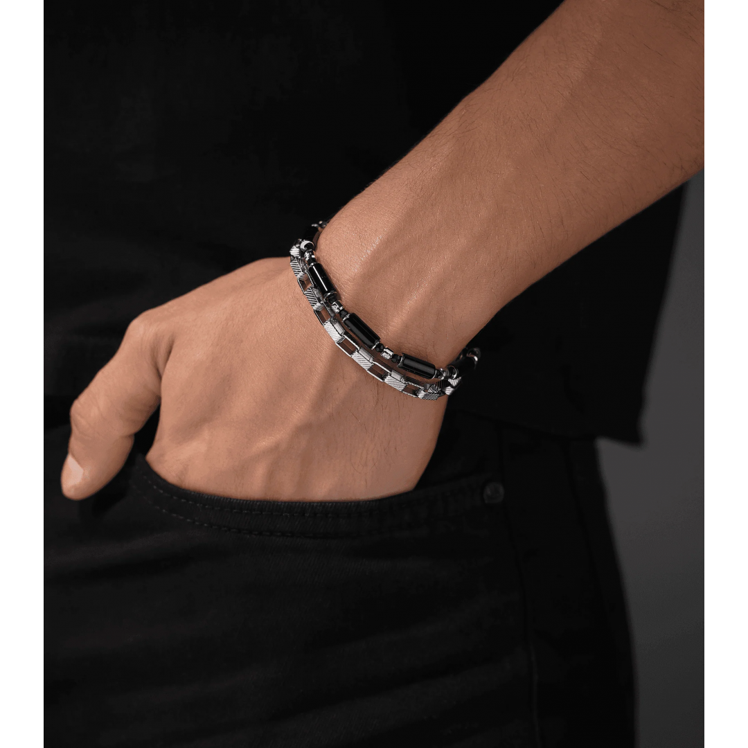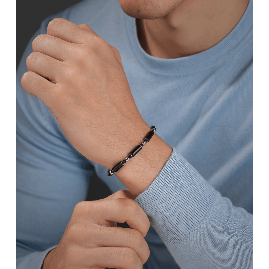 Por que se misturar quando você pode se destacar com SILO by POLICE? A pulseira apresenta uma combinação cativante de elegantes contas pretas circulares e cilíndricas em uma corrente de aço inoxidável. Este contraste ousado reflete sua resistência ao conformismo.