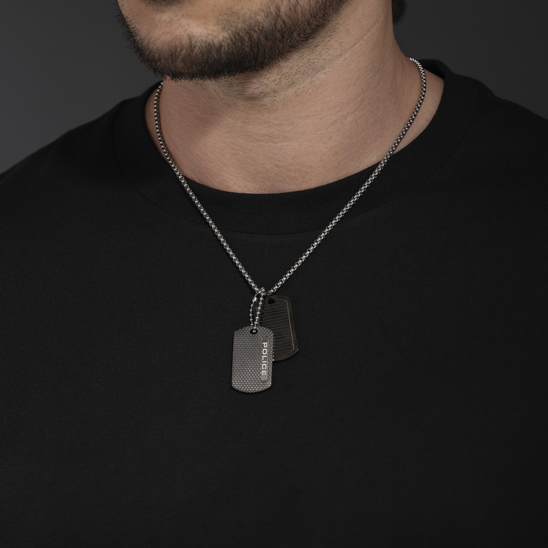 Atitude a dobrar, estilo a dobrar. O colar Duet apresenta dois pendentes arrojados em forma de chapa preta, cada um com a assinatura da POLICE. Uma afirmação moderna de individualidade, pensada para quem não tem medo de desafiar os limites entre o ousado e o sofisticado.