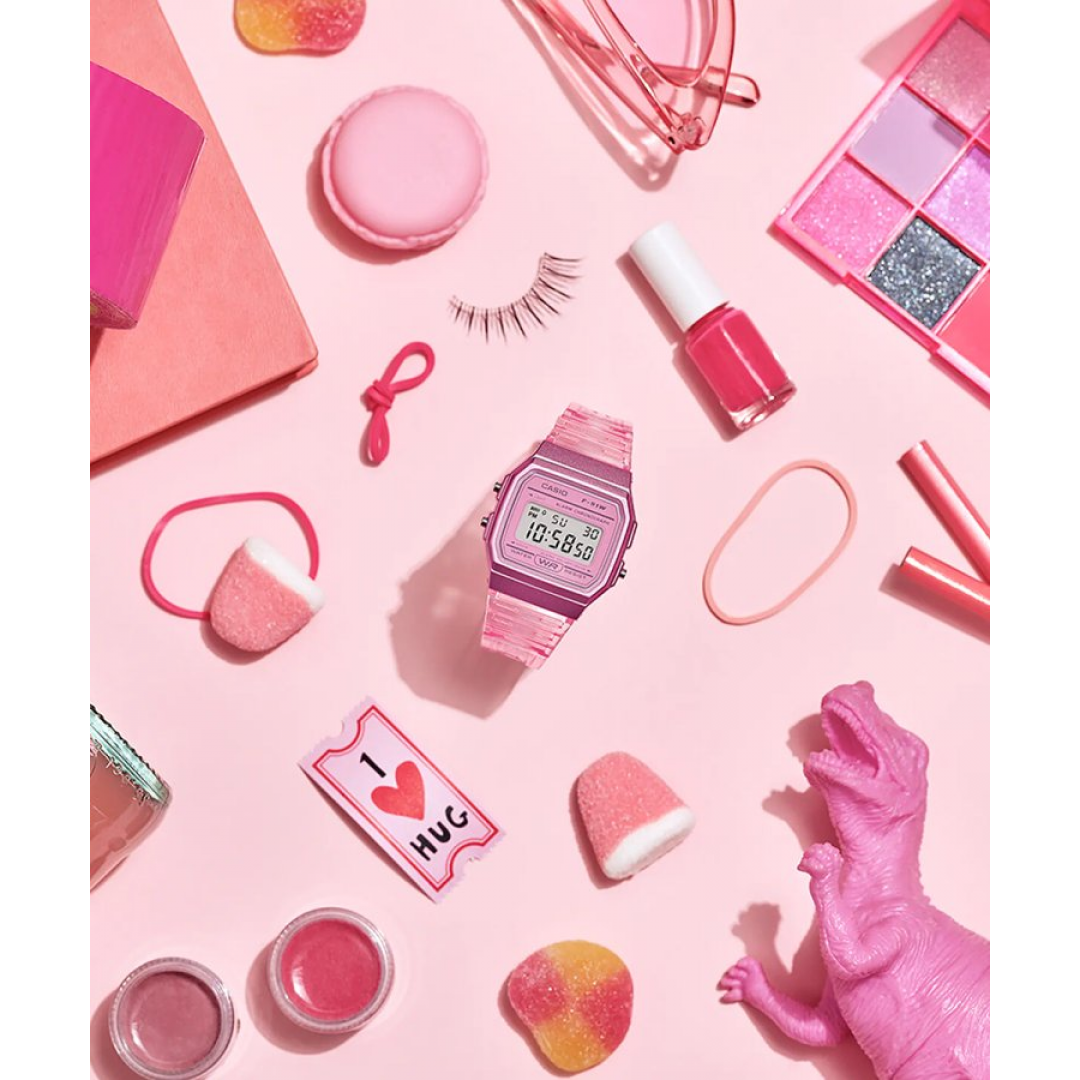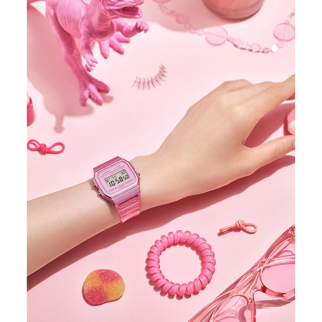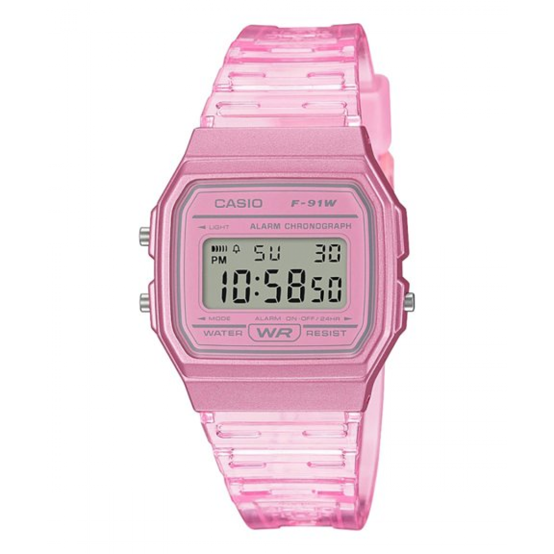 Relógio Casio Collection Digital Rosa - F-91WS-4EF com caixa e bracelete azuis em resina.