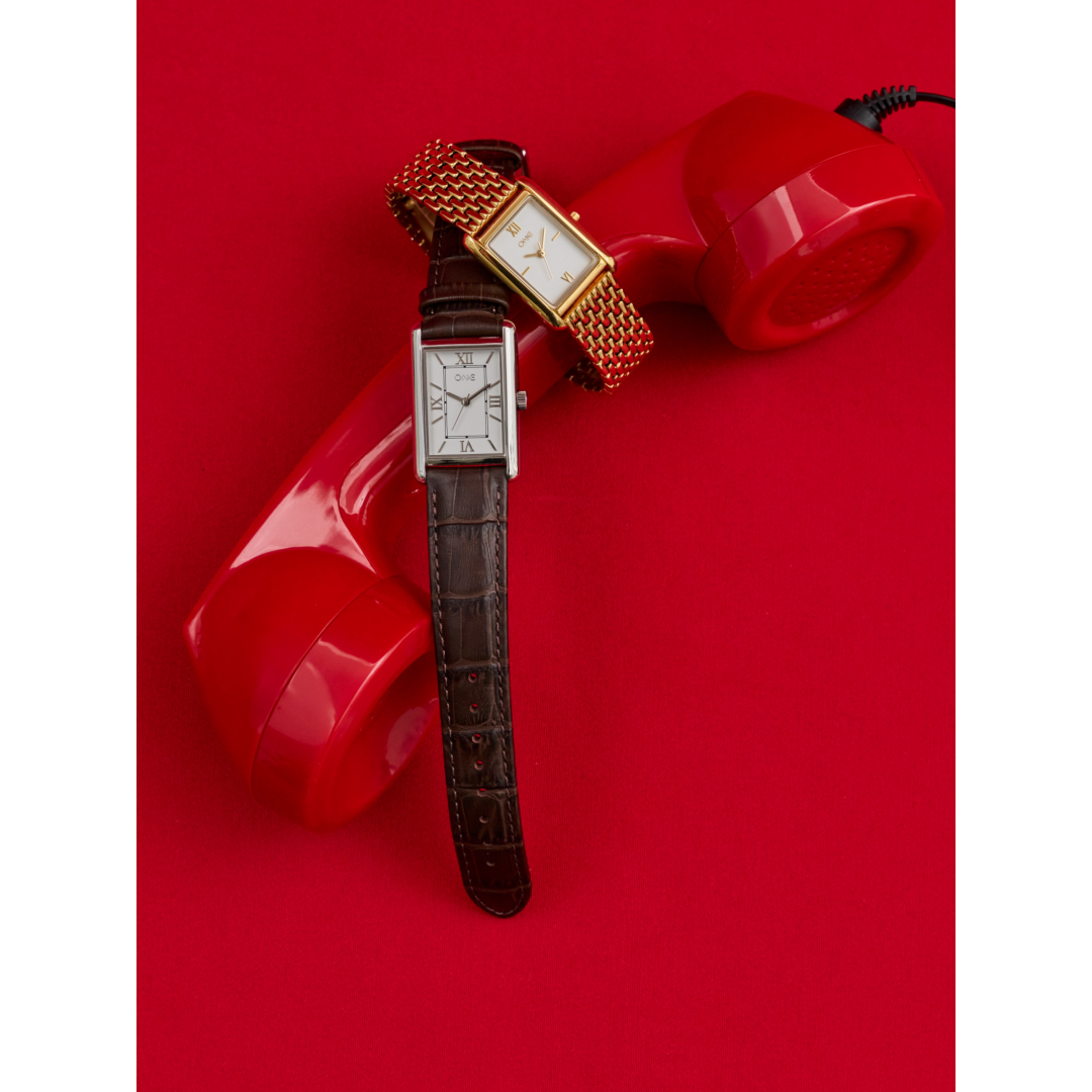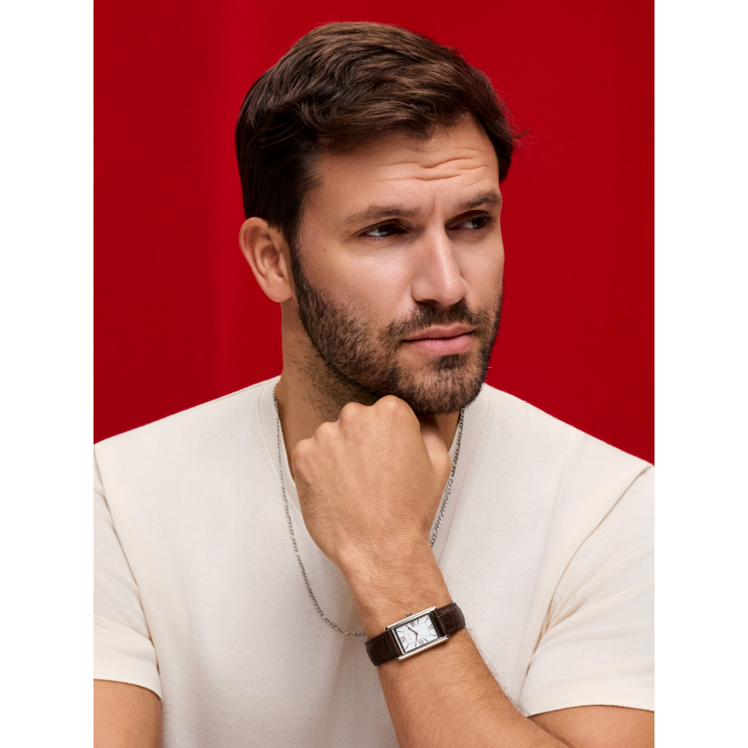 O relógio Rainier nasce inspirado numa das histórias de amor mais icónicas de sempre, entre a actriz Grace Kelly e o Príncipe Rainier e celebra a ideia de que o amor verdadeiro é feito de escolhas, coragem e entrega. Com um design clássico e sofisticado, o relógio apresenta uma caixa retangular em aço inoxidável e uma elegante bracelete em pele castanha, pensadas para acompanhar o ritmo do dia a dia com conforto e distinção. O mostrador de tom claro, de linhas limpas e marcadores delicados, é complementado por ponteiros elegantes que reforçam a sua estética intemporal e equilibrada. Uma escolha ideal para homens que valorizam uma elegância clássica, o detalhe e as histórias que permanecem.