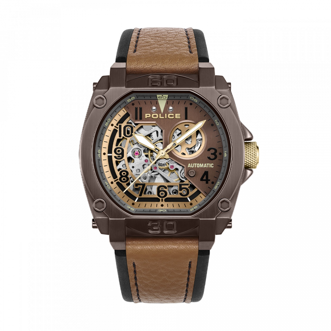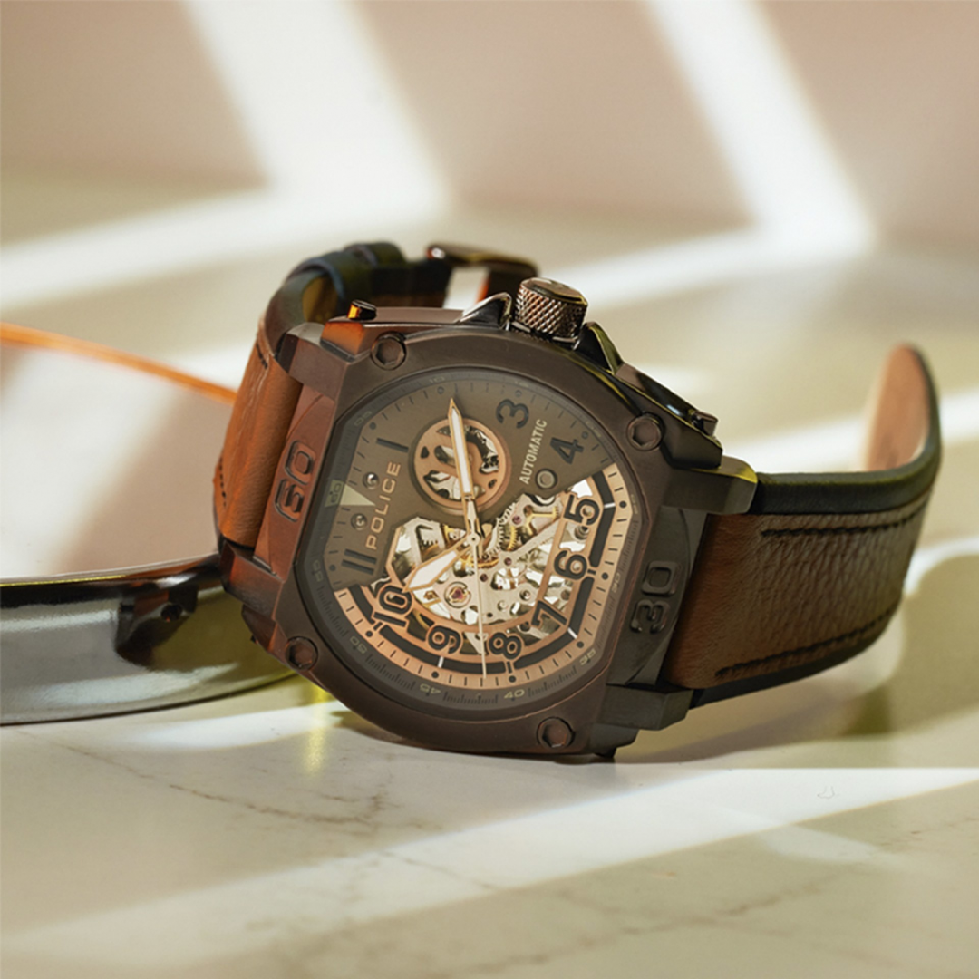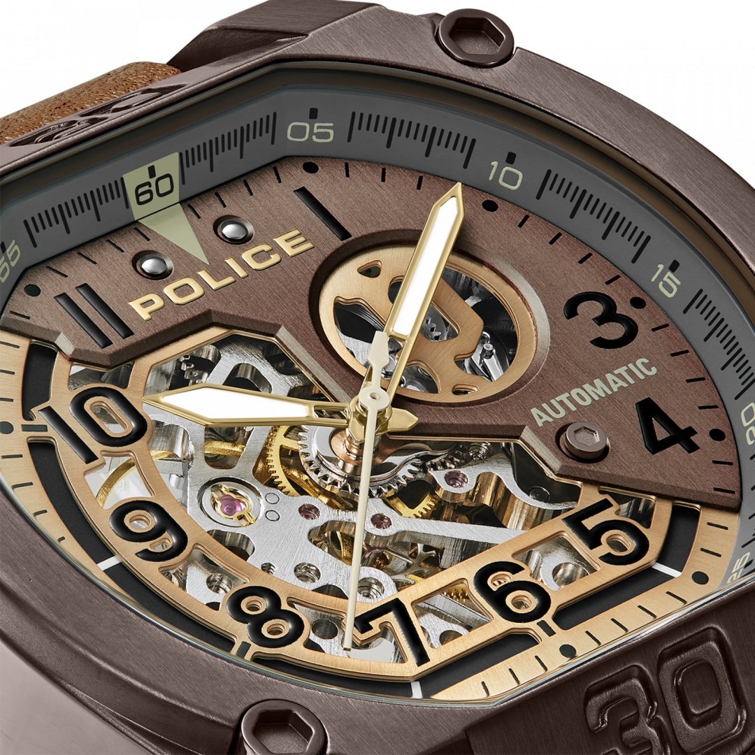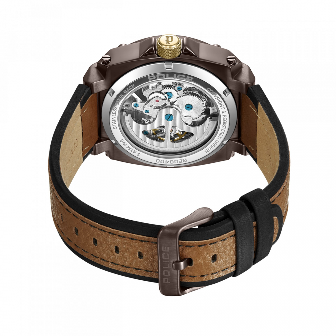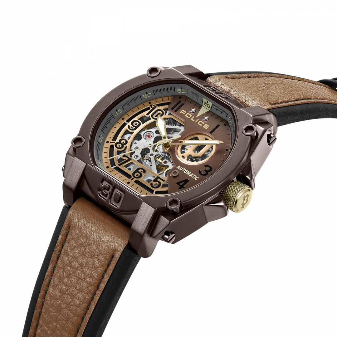 Se você se identifica mais com sofisticação ousada, então o Norwood da Police é a sua escolha perfeita. Com um mostrador cáqui distinto com acabamento bronzeado e cinza quente com transparência parcial, este relógio sem dúvida será um sucesso entre os criadores de tendências. Equipado com movimento automático e ostentando um design marcante, o relógio exibe com orgulho a essência POLICE. Para complementar seu charme, os detalhes em ouro banhado a íon combinam perfeitamente com a pulseira de couro respirável de dupla camada em preto oleoso e bege búfalo.