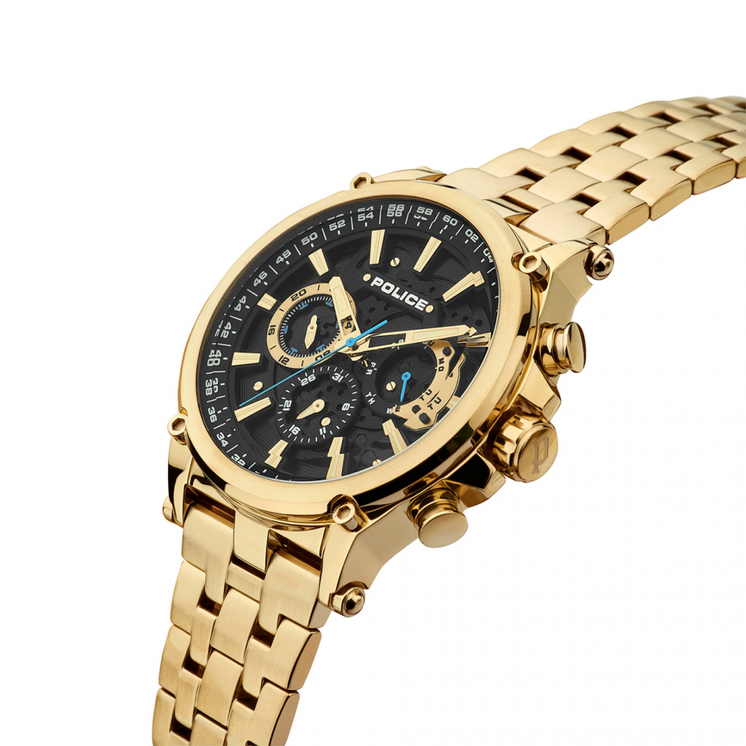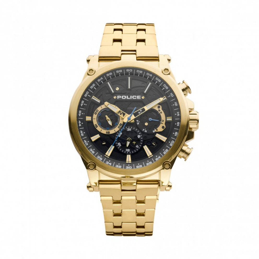 O relógio POLICE Taman com caixa e bracelete em aço inoxidável dourado e mostrador preto é um modelo para homens com estilo e personalidade fortes.