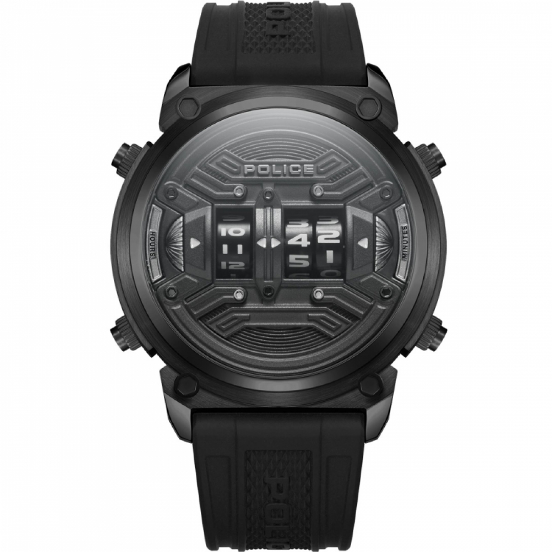 Relógio Police Rotor PEWJP2228502. Este tem uma caixa com diâmetro aproximado de 50 mm, cor preta e bracelete cor preta. Está equipado com um movimento quartzo. O relógio é estanque até 50 m | 5 bar | 5 atm. Composição: aço, silicone.