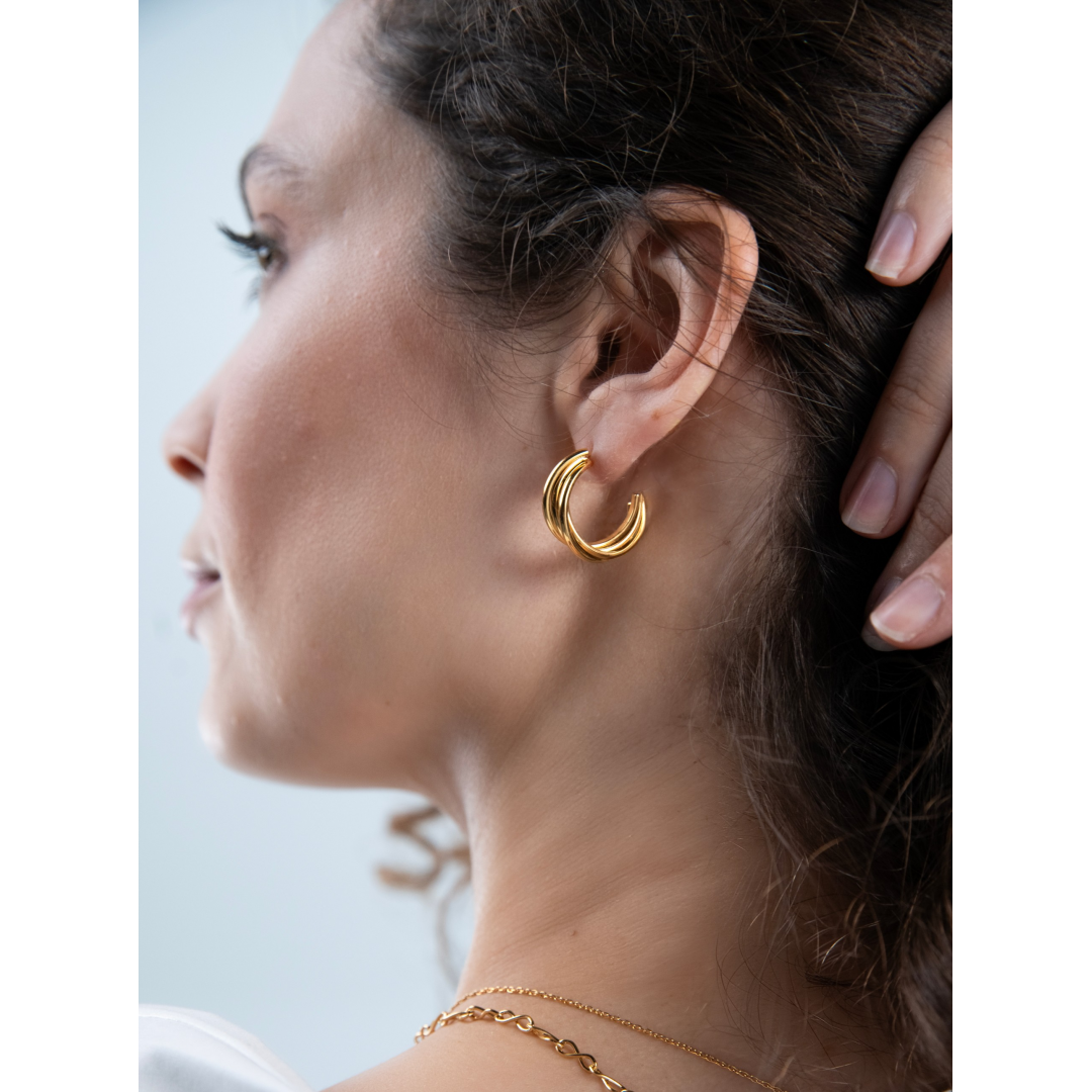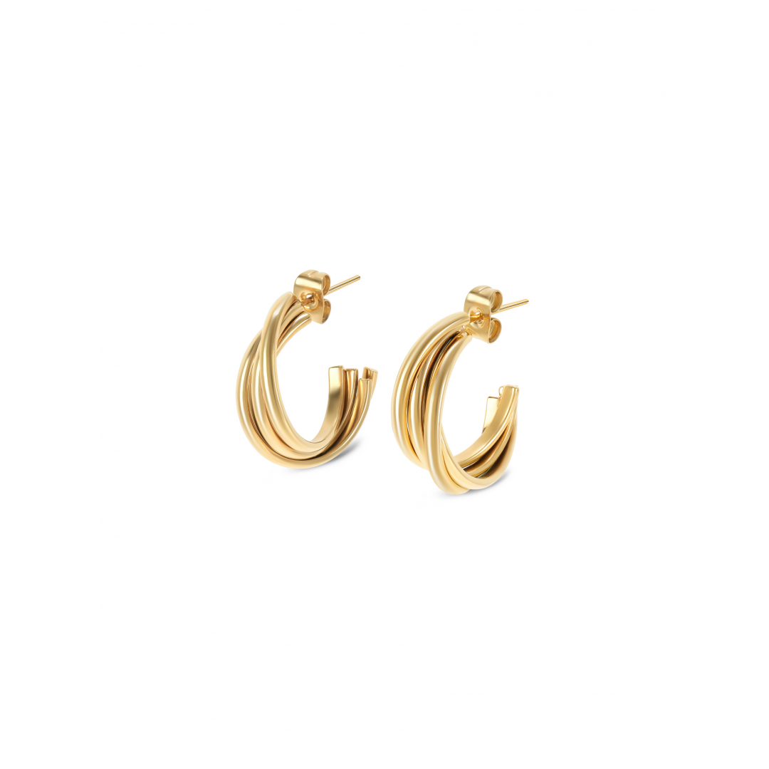 Os brincos Solid da coleção Luminous são integralmente dourados e têm um twist (literal) no seu padrão. Umas argolas (half-hoops) de tamanho pequeno compostas por três tiras arredondadas entrelaçadas e unidas entre si desde o espigão até a sua terminação. O fecho dos brincos é em borboleta.