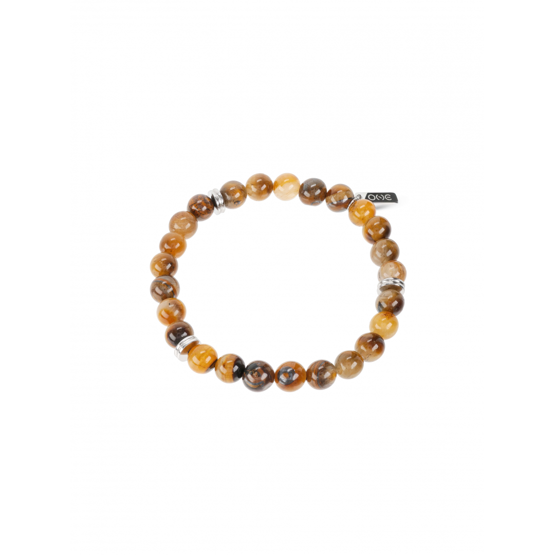 A pulseira One Men Woods é composta por pedras naturais olho de tigre intercaladas por três finos separadores prateados. Um acessório distinto que combina o brilho do metal com a beleza e singularidade desta pedra conhecida pelas suas tonalidades únicas em tons de castanho e dourado. Perfeita para apreciadores de acessórios com uma vibração natural e terrosa, podendo ser usada em ocasiões casuais ou até mesmo para adicionar um toque de destaque em eventos mais formais.