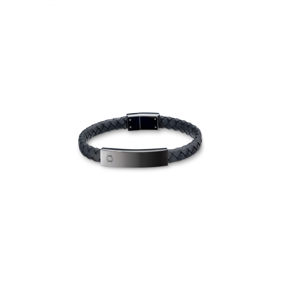 A pulseira Maven da coleção One Men é composta por uma trança em pele cinzenta com uma barra de metal prateado e um fecho de encaixe magnético também em prateado gun matte. O acabamento brilhante do metal contrasta com a textura mais fosca da pele dando à pulseira um toque mais edgy.