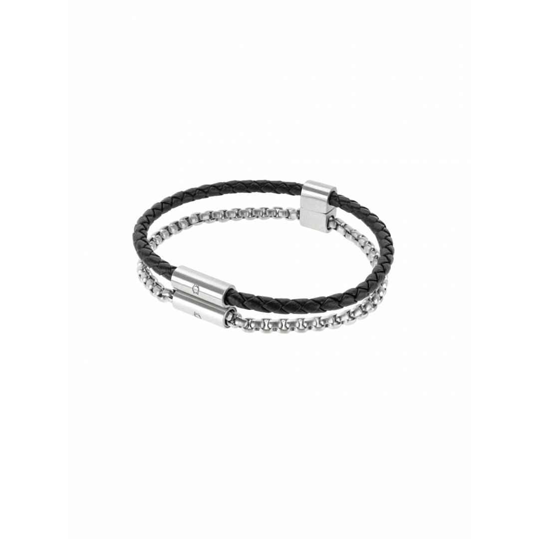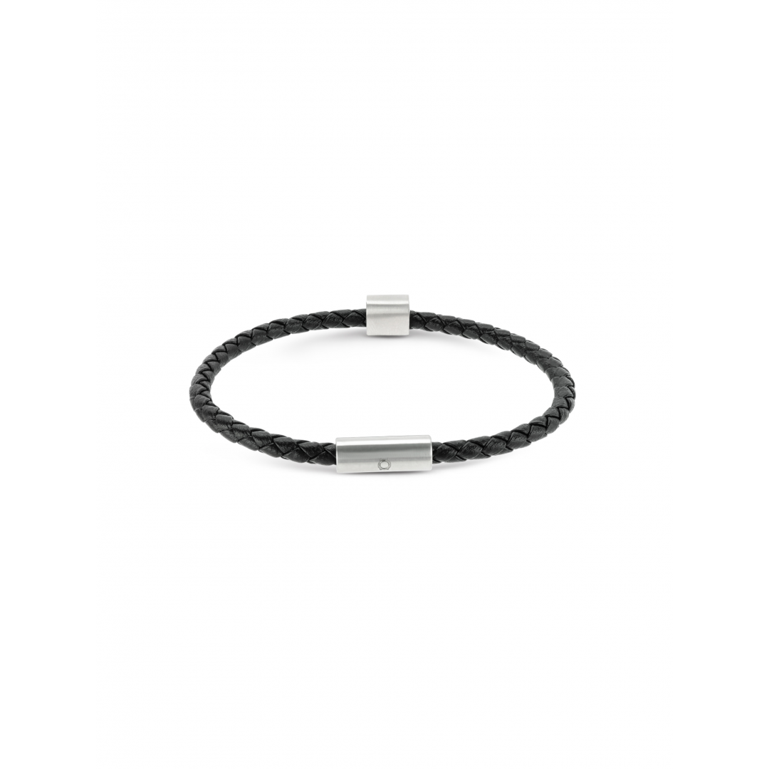 A pulseira Linkage da coleção de acessórios One Men é uma peça 2 em 1, composta por dois fios um de pele genuína em preto e outra em aço inoxidável. Os dois fios estão unidos em pontos opostos da pulseira por dois ímans em metal prateado criando a ilusão de ser apenas uma pulseira dupla mas, no entanto, podem ser usados de forma isolada. A pulseira é um acessório bem moderno, que combina dois elementos muito fortes nas peças One Men e com dois fechos bem inovadores.