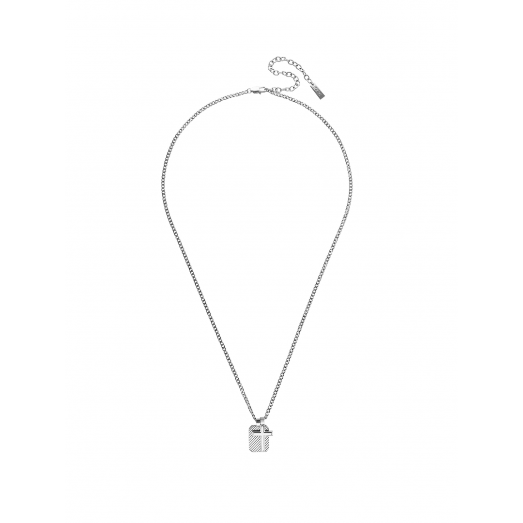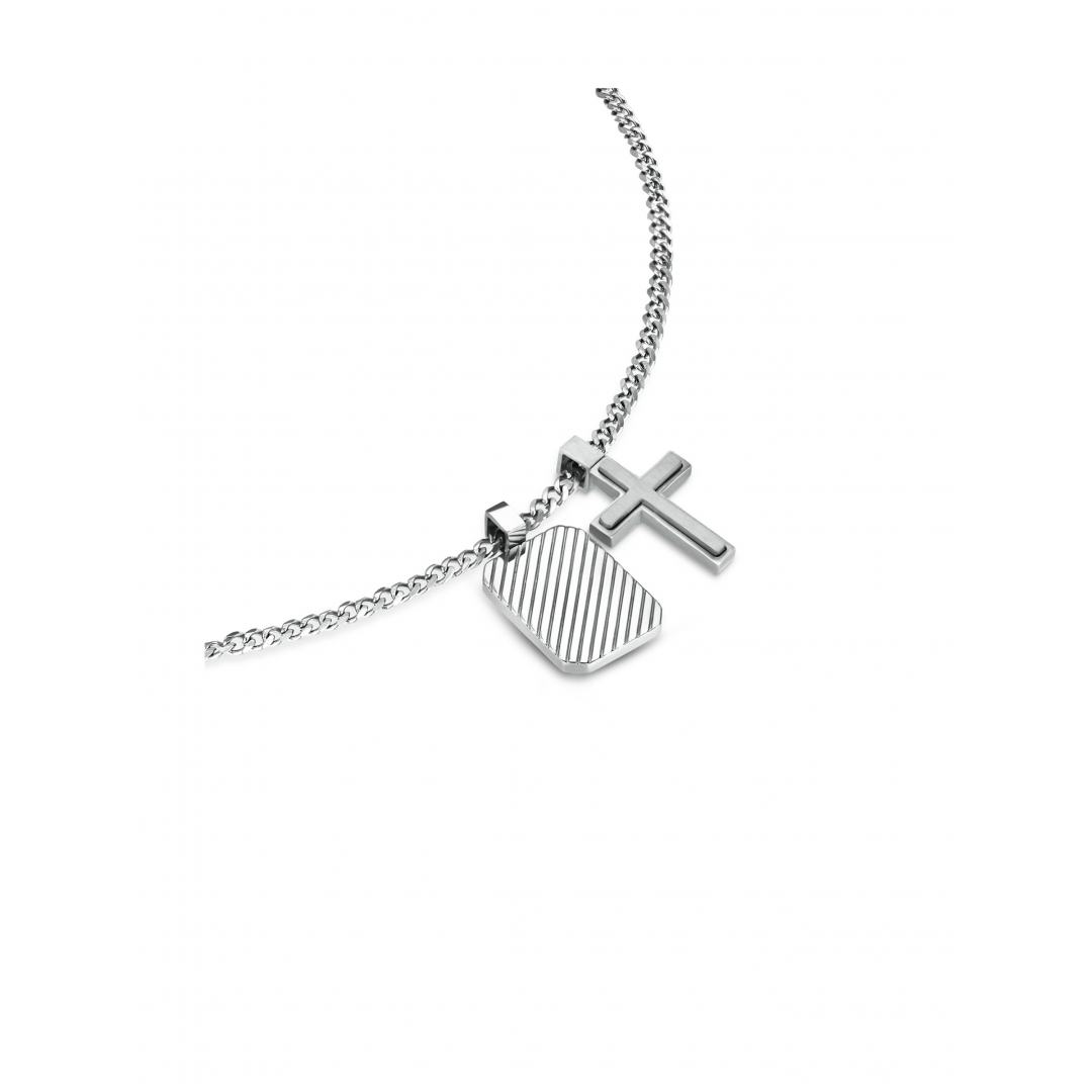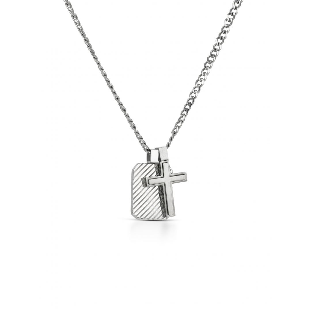 O Colar Guardian Steel é composto por uma corrente em aço prateado de malha fina, resistente e confortável para o uso diário. O destaque da peça é o pendente em formato retangular, com acabamento texturado, sobre o qual se sobrepõe uma cruz em relevo, também em tom prateado. A combinação das superfícies cria contraste visual, mantendo um design sóbrio e equilibrado. O colar termina com um fecho ajustável, permitindo adaptar o comprimento ao gosto pessoal. Ideal para quem procura um colar masculino discreto, com significado e fácil de integrar no dia a dia.