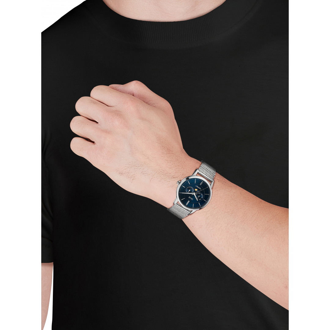 Um relógio masculino da One, de estilo clássico e elegante, com bracelete e caixa em prateado e mostrador azul com as fases da lua. Ideal para um homem confiante e moderno. Dê nas vistas em todas ocasiões com este modelo da coleção Legendary.