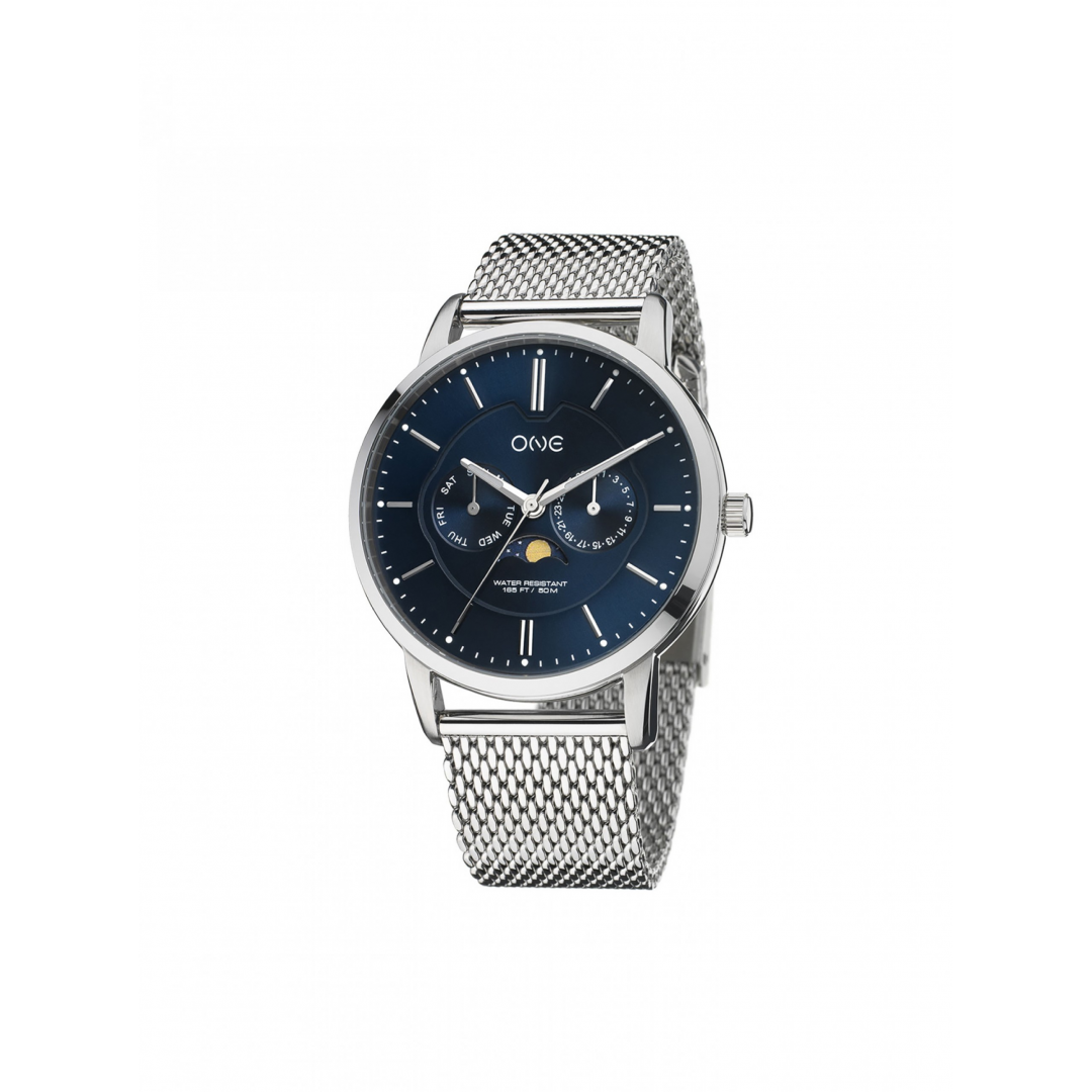 Um relógio masculino da One, de estilo clássico e elegante, com bracelete e caixa em prateado e mostrador azul com as fases da lua. Ideal para um homem confiante e moderno. Dê nas vistas em todas ocasiões com este modelo da coleção Legendary.