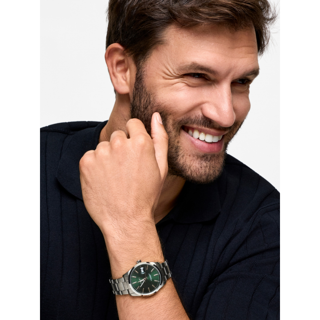 O relógio analógico Noble é um modelo masculino que segue a tendência de caixas e mostradores mais discretos sem perder a robustez no seu design. É um relógio moderno, de aço inoxidável onde o prateado domina, mas o destaque recai sobre a clássica cor do mostrador, o verde, que realça os indexes e os três ponteiros (horas, minutos e segundos). Na posição das 3h, em substituição do index, há uma pequena janela com indicação do dia do mês. O relógio conta ainda com resistência à água de 50 metros. Ideal para quem gosta de relógios masculinos com um toque de cor e um design moderno.