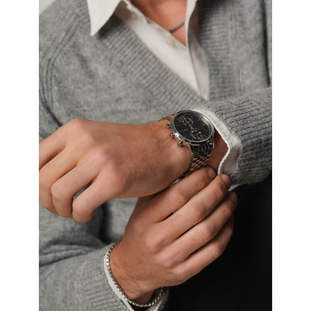 O relógio analógico Elite é uma peça robusta, moderna e contemporânea. Com um mostrador redondo e de fundo cinzento escuro, sobressaem os três ponteiros e indexes prateados, no mesmo tom que a bracelete de elos em aço inoxidável . O relógio Elite conta ainda com multifunções: indicação dos dias da semana na parte superior do mostrador e dos dias do mês na parte inferior. Resistência à água de 5 ATM.