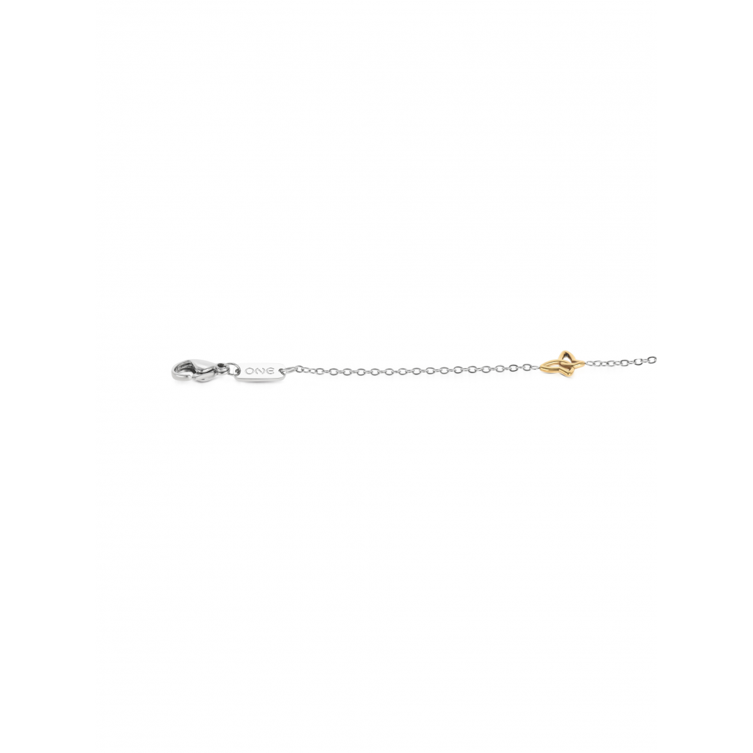 A pulseira Duo da coleção Butterfly é uma peça delicada e muito feminina. É composta por uma malha prateada muito fina e por dois pendentes com a forma típica de uma borboleta espaçados na parte central da pulseira. Um dos pendente, em prateado e dourado, é maior e tem uma forma animal mais realista enquanto que o segundo, mais pequeno e totalmente em dourado tem uma forma mais minimalista da borboleta. A pulseira termina com um fecho em mosquetão e com um extensor tornando-a ajustável a diferentes larguras de pulso. Esta coleção One capta a beleza efémera das borboletas, uma fusão entre delicadeza e poder da Natureza.