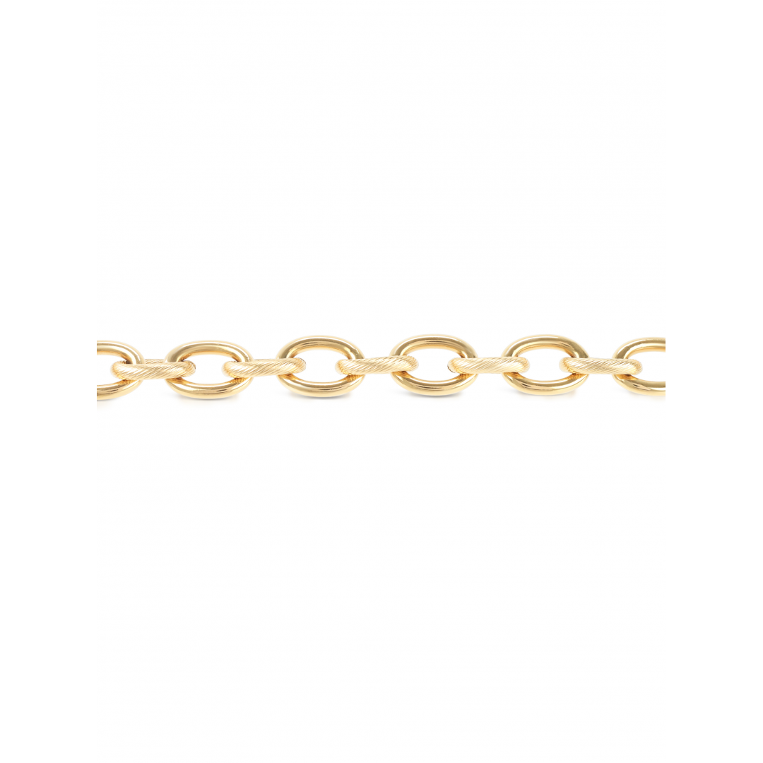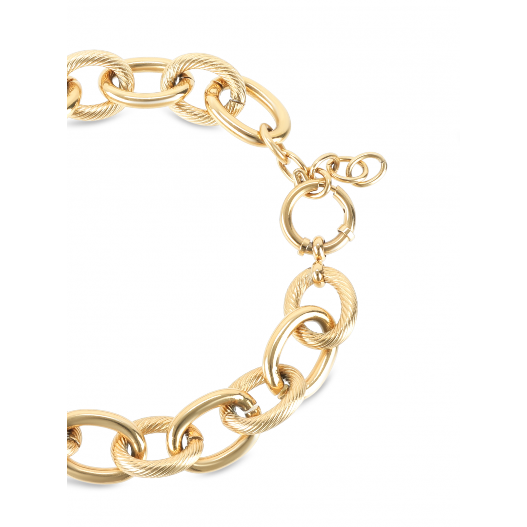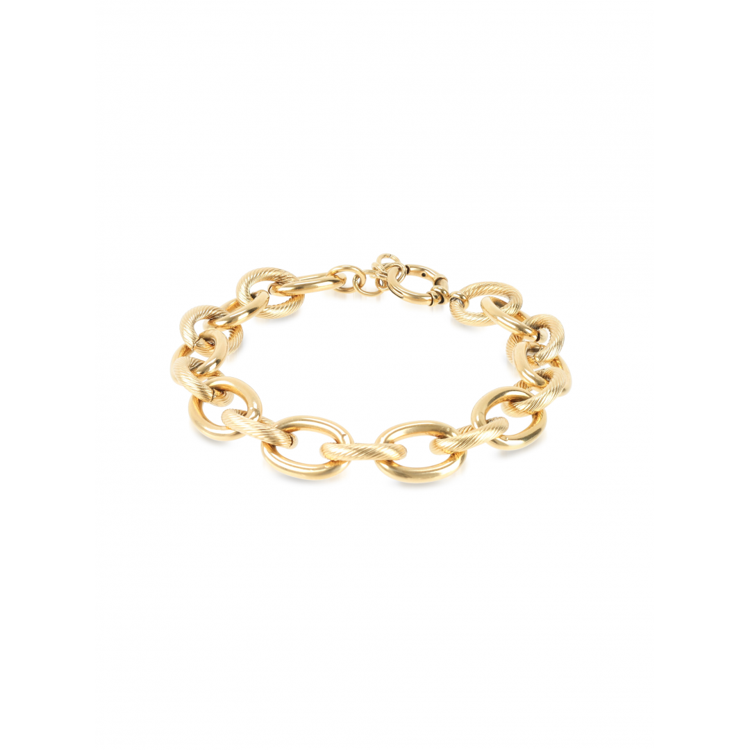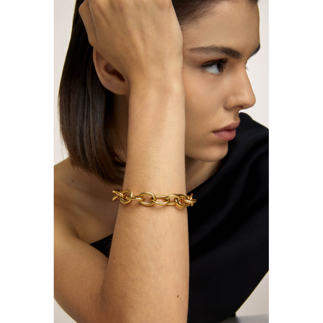 A pulseira Link Connections dourada de elos portugueses da coleção Arm Candy é uma peça marcante com um estilo mais clássico. Esta malha é composta por diversos elos circulares intercalados na vertical e horizontal tornando-a um acessório que pode ser utilizado sozinho para enaltecer um look mais minimalista ou em combinação com outros acessórios para um look maximalista. Termina com um fecho mosquetão ajustável.