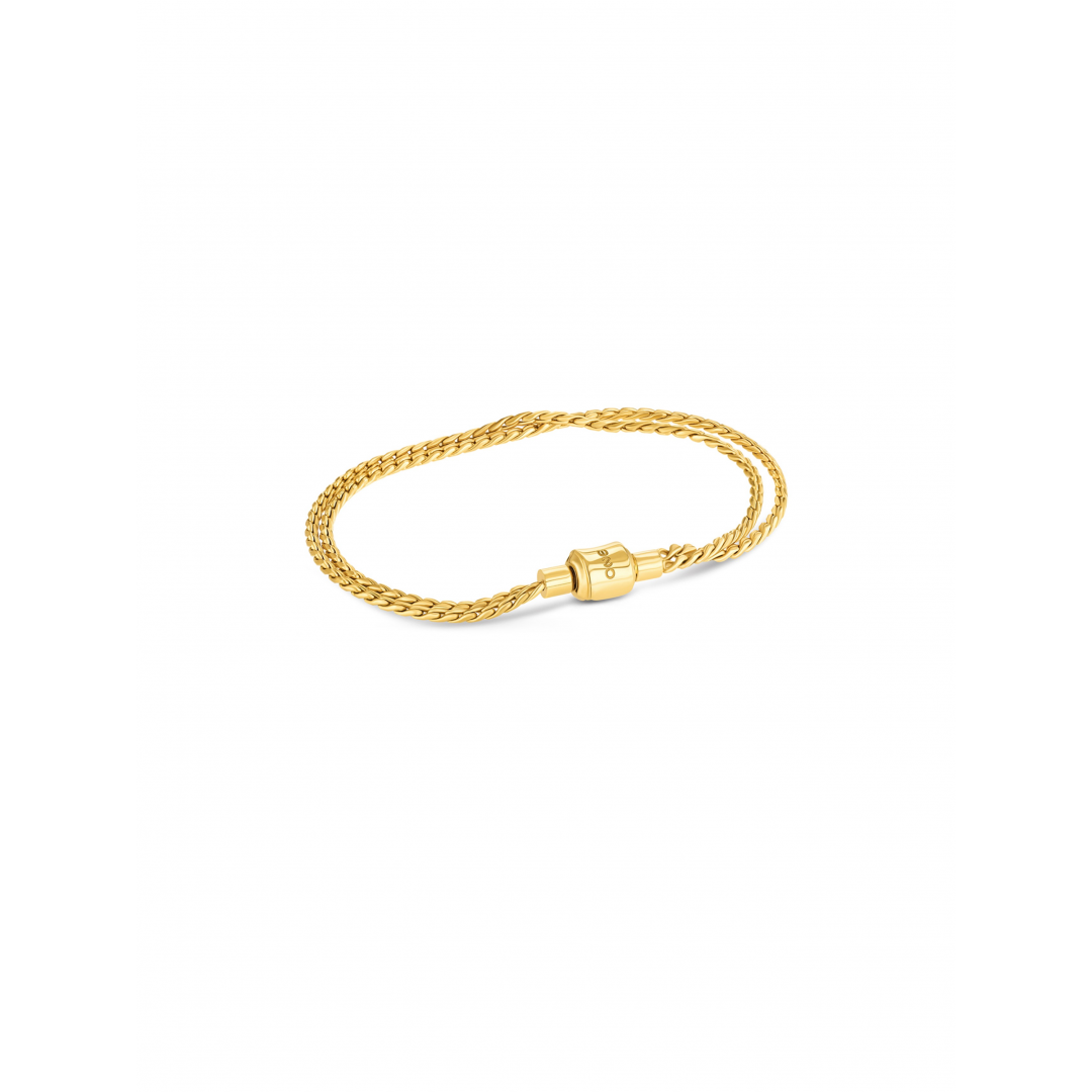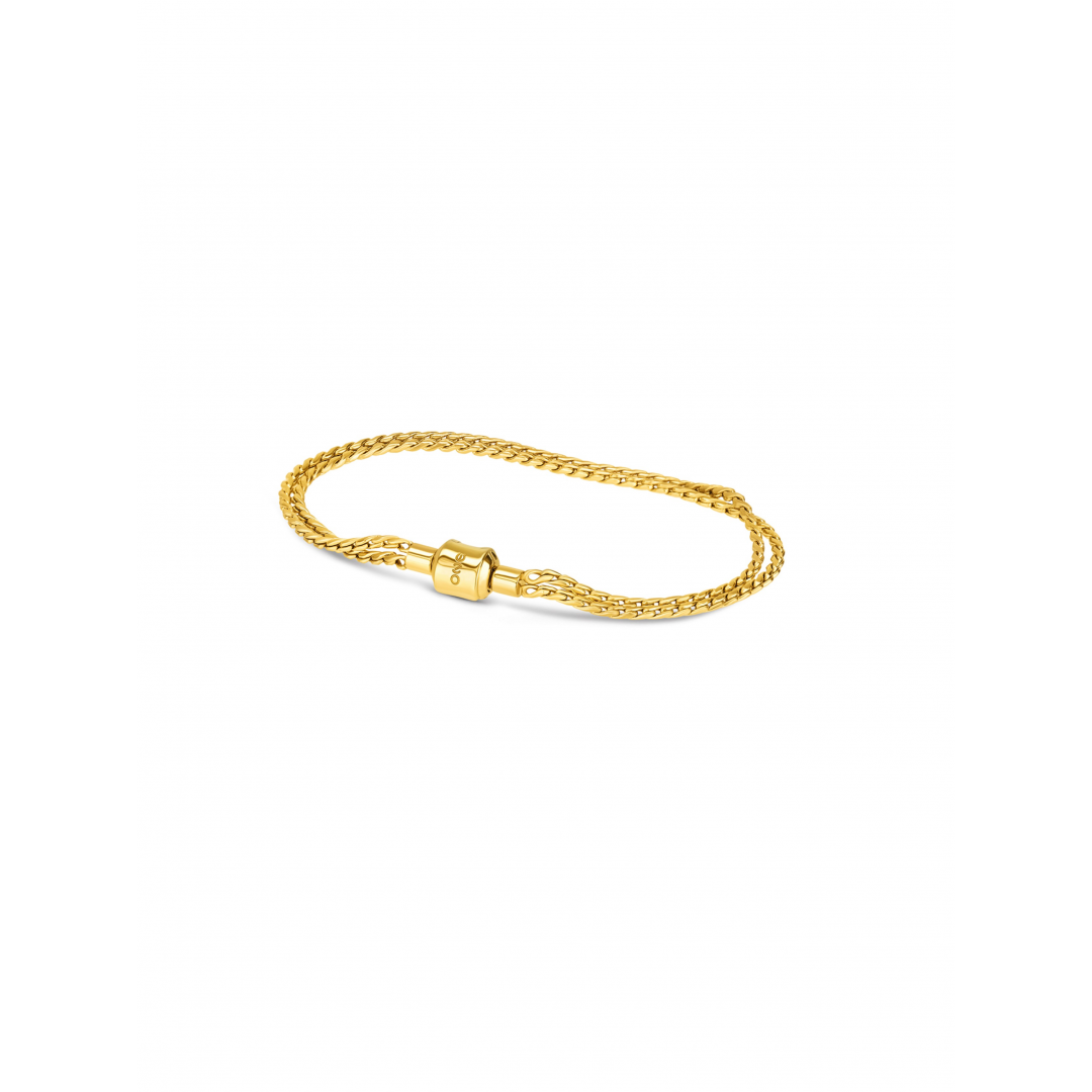 A pulseira Energy Master Soft totalmente dourada é composta por dois fios de malha, formados por elos entrelaçados entre si que criam um efeito visual de movimento contínuo e fluido. A pulseira termina num fecho de trinco cilíndrico, seguro e fácil de utilizar. A partir de uma das extremidades é possível colocar charmes e charmes bond, começando assim a criar a tua história Energy for Life. Uma memória, um momento inesquecível eternizado ao pulso.