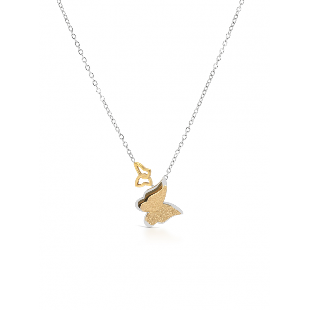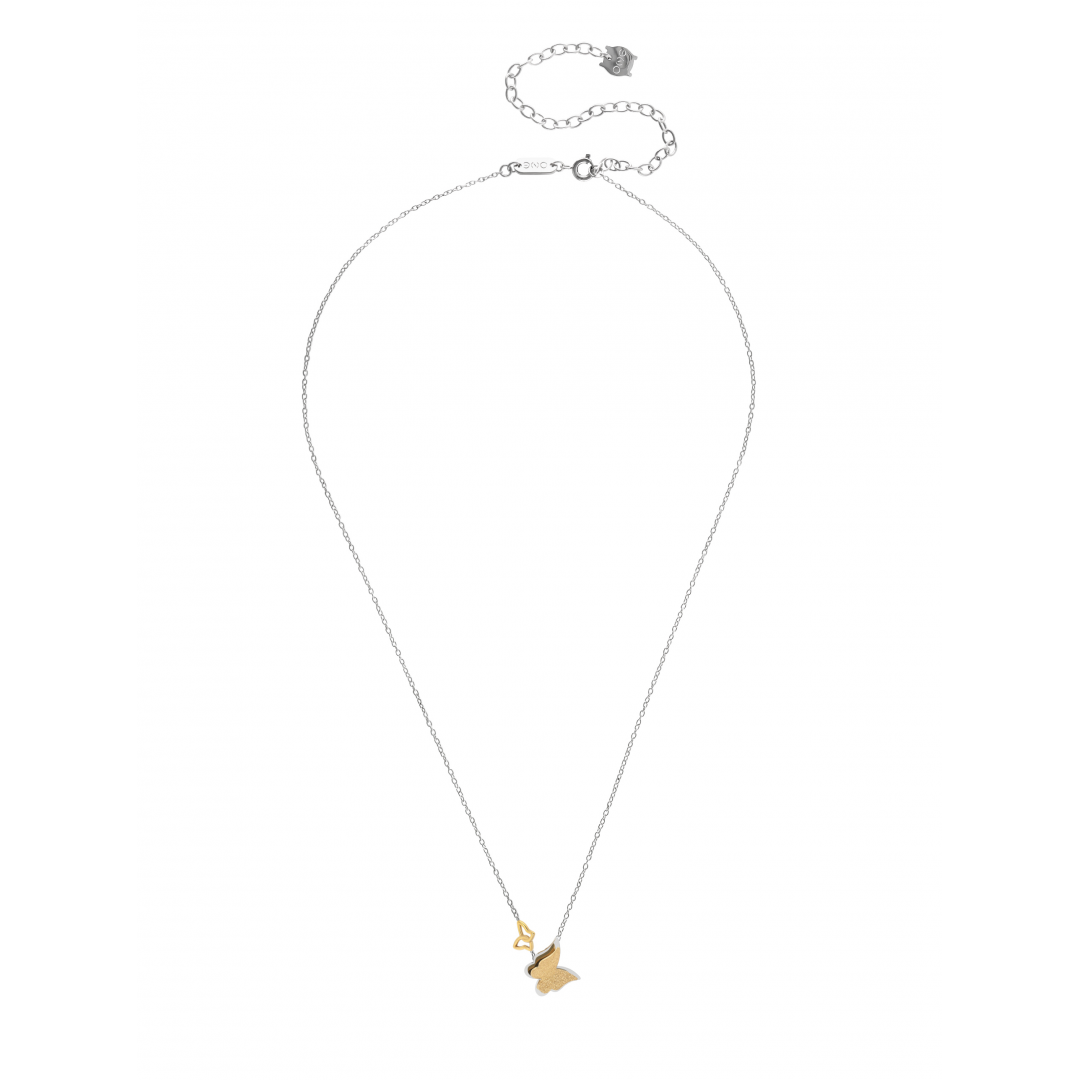 O colar Duo da coleção Butterfly é uma peça delicada e muito feminina. É composto por uma malha prateada muito fina e por dois pendentes com a forma típica de uma borboleta. Um dos pendentes, em dourado e com uma forma mais minimalista de borboleta, está fixo na malha do colar e o segundo pendente, bicolor com uma forma de borboleta mais realista, está móvel ao longo de uma parte do fio. O colar termina com um fecho em bóia e com um pequeno extensor tornando-o mais versátil para ser utilizado com diferentes comprimentos. Esta coleção One capta a beleza efémera das borboletas, uma fusão entre delicadeza e poder da Natureza.