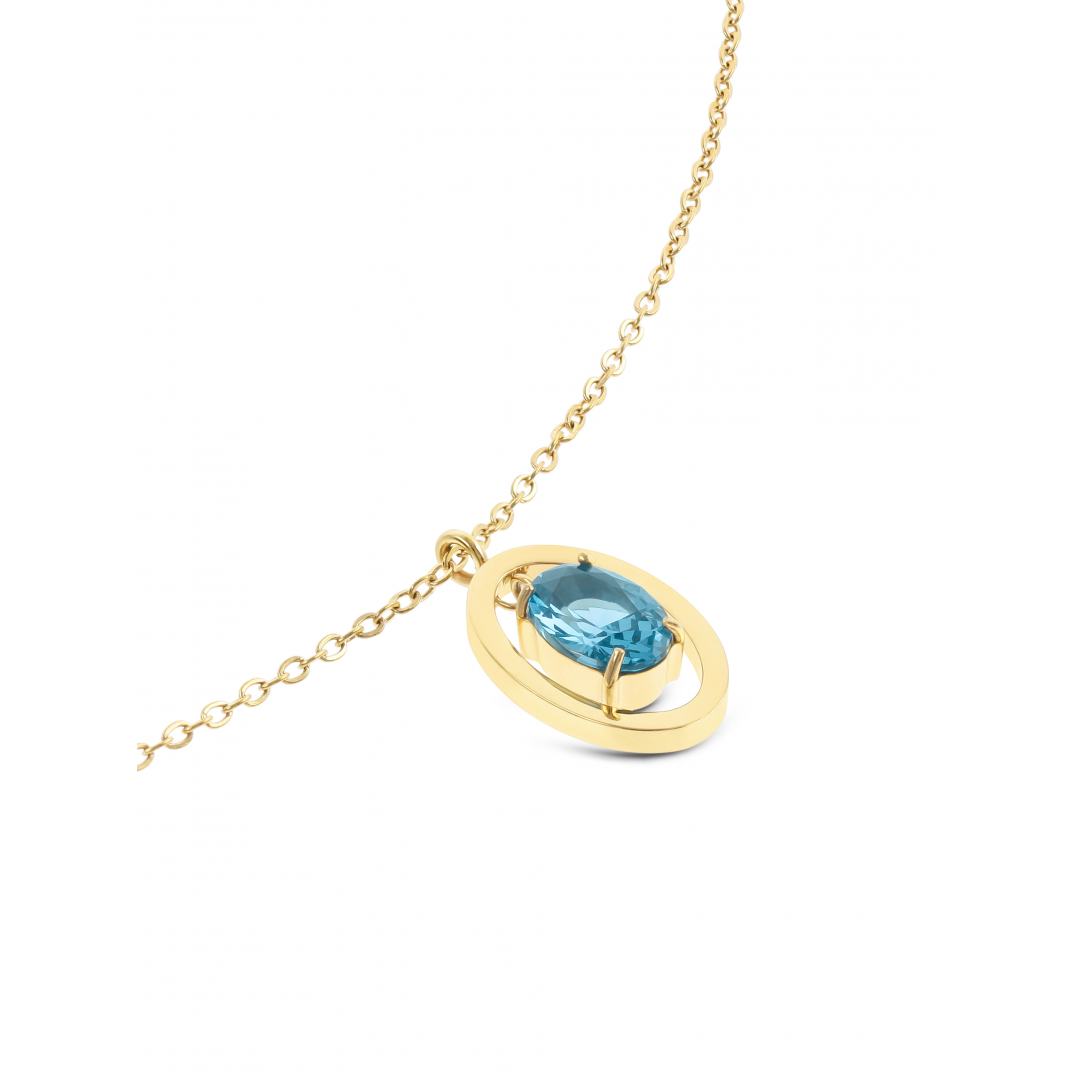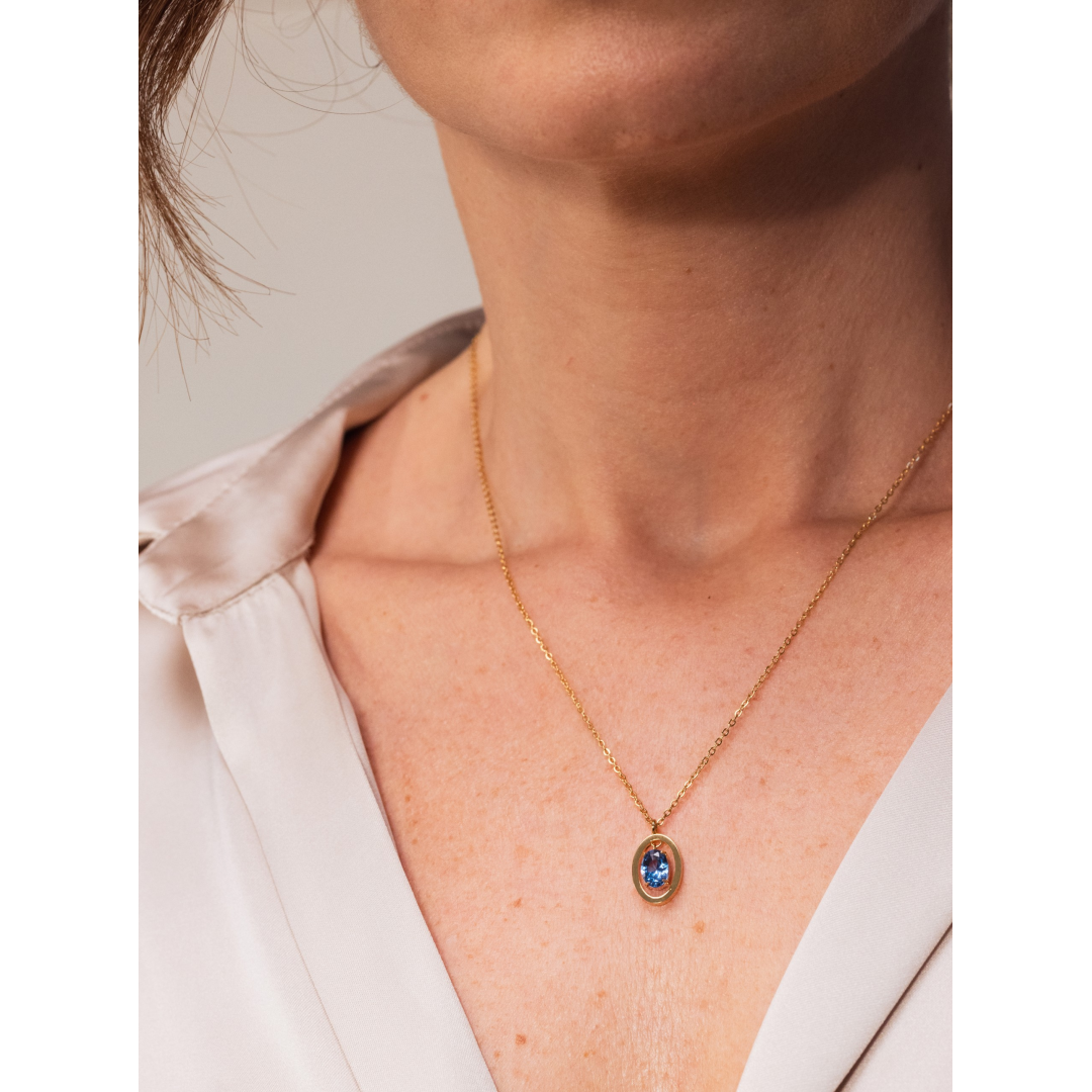 O colar Setembro - Prosperidade da coleção Birthstones é uma peça delicada e carregada de simbolismo. É composto por uma malha de elos dourada muito fina e discreta e por um pendente oval cujo design dá a ilusão que o cristal zircónia azul está a flutuar dentro de uma moldura. Esta coleção limitada de colares foi criada para assinalar e celebrar os 20 anos da One, enaltecendo os desejos e intenções que desejamos a todos.