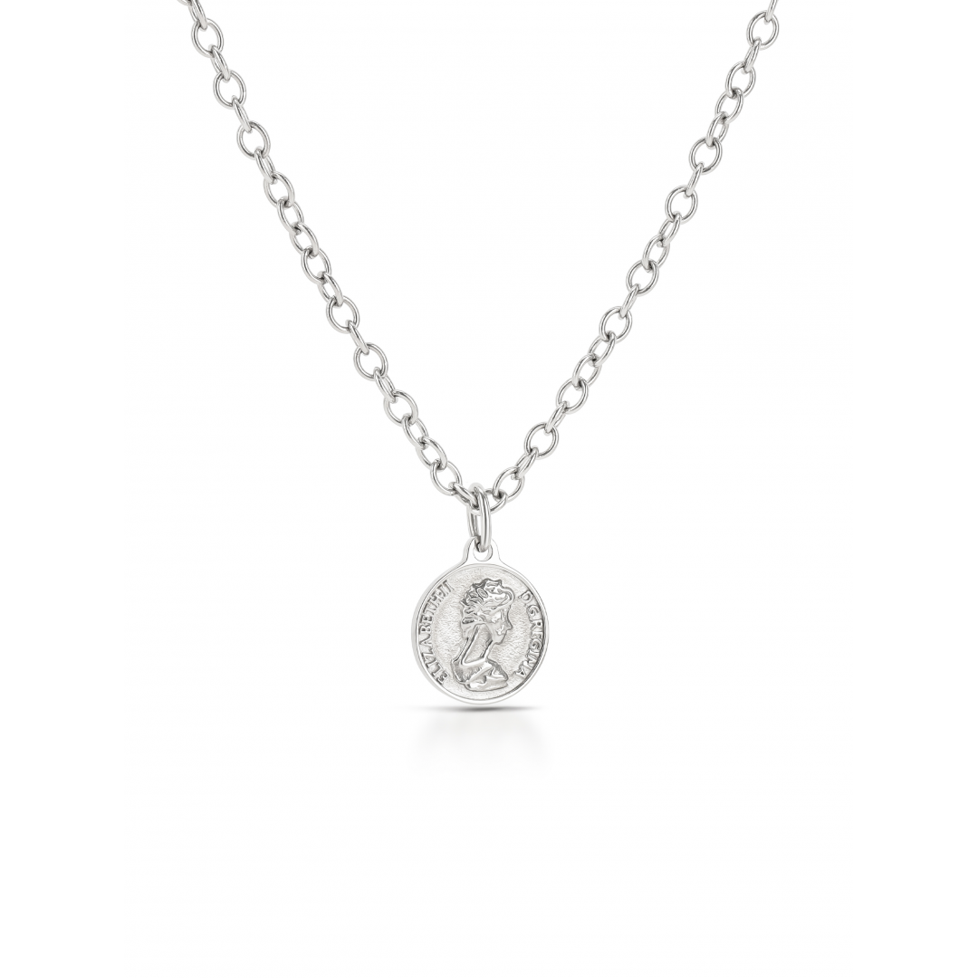 O colar Royalty em prateado da coleção Neckmess é uma peça que equilibrada com pormenores que vão captar a tua atenção. É composto por uma malha prateada de elos redondos e por um pendente também redondo muito semelhante a uma moeda. Numa das faces do pendente está uma figura humana masculina de perfil e com um verso liso, para uma opção mais minimalista. O colar termina com um fecho e extensor para que possa ser utilizado em vários comprimentos. It’s a mess, it’s Neckmess - uma coleção a pensar nas mulheres e na sua história, que é contada ao pormenor e em cada detalhe que levam ao peito.