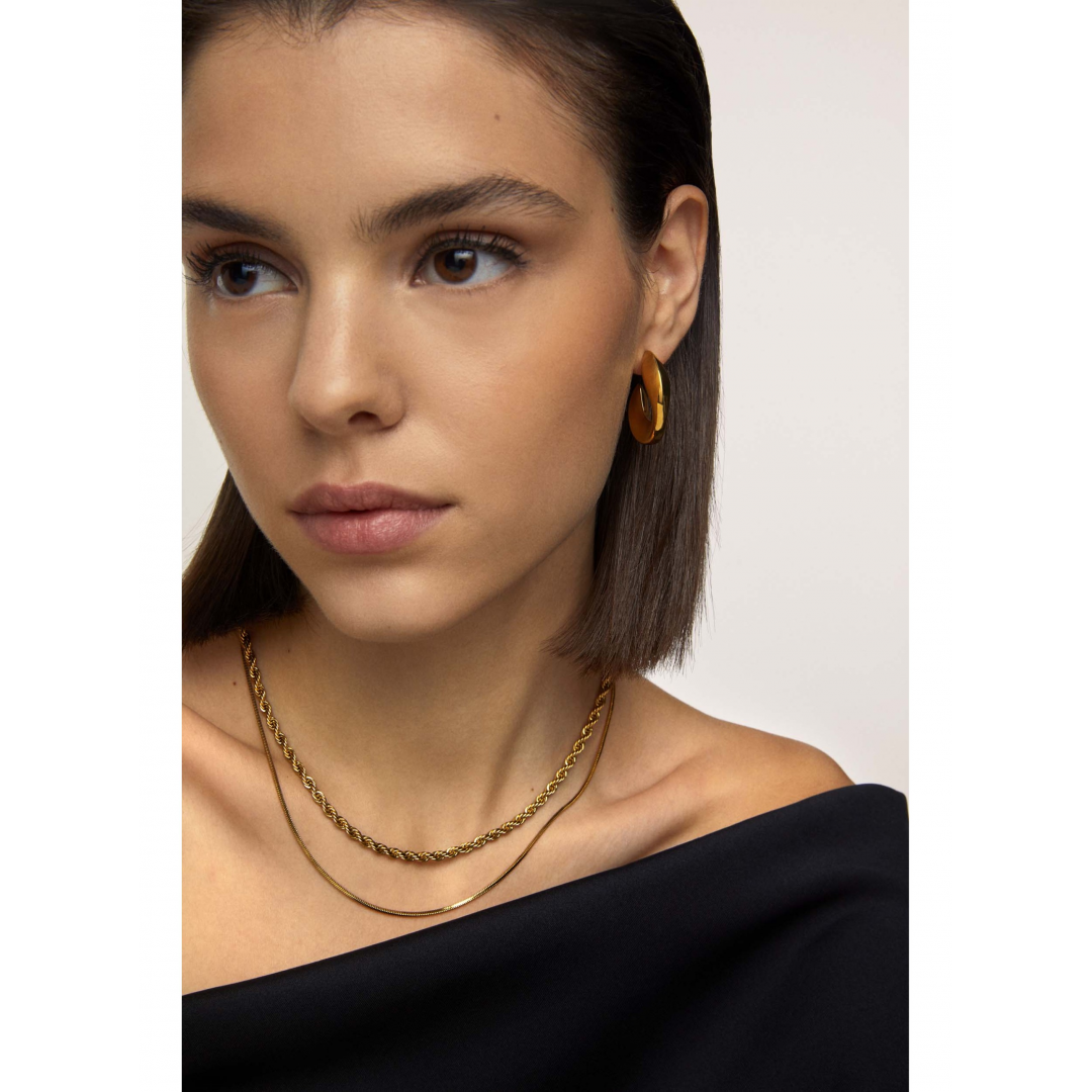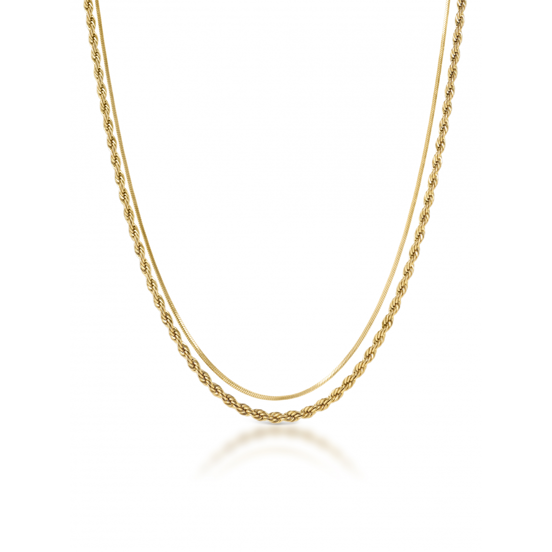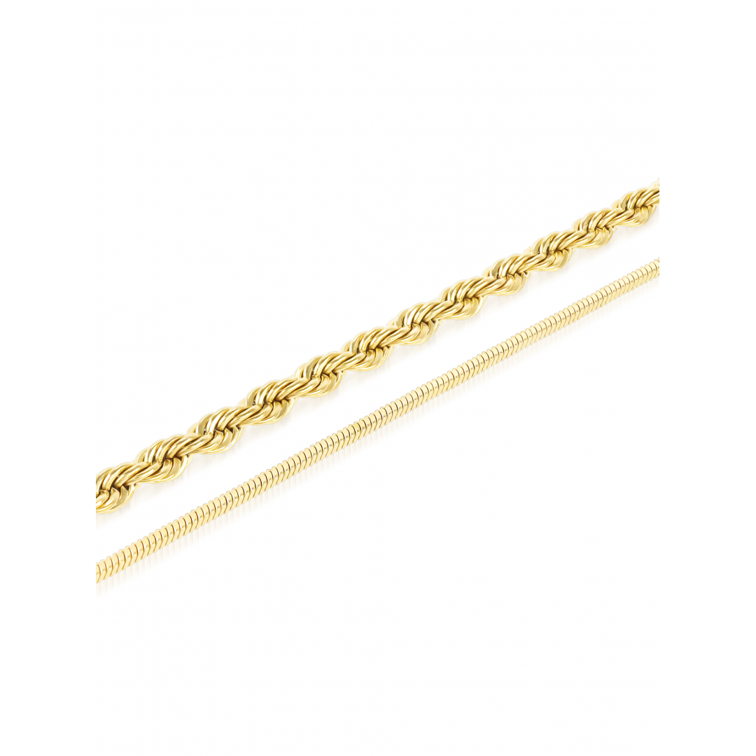 O set de colares Twisted Betrayal é composto por dois fios dourados com estilos distintos mas que combinam na perfeição. O primeiro colar tem uma malha estilo cordão baiano, caracterizado por uma corrente dourada com elos entrelaçados num padrão único, ao passo que o segundo colar é tem uma malha estilo rabo de rato que consiste numa corrente dourada flexível e suave ao toque. O set colares Twisted Betrayal é o acessório que uma vez posto não vais querer tirar. É perfeito para qualquer ocasião adicionando um toque de luz a qualquer look.