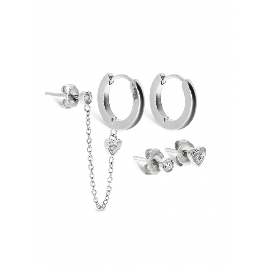 O set de brincos Silvery Four da coleção Ear Party são uma escolha versátil e completa para quem deseja adicionar um toque de luminosidade e estilo aos seus piercings. O conjunto inclui quatro brincos, cada um com um design exclusivo de cor prateada. Um pequeno coração e um discreto stud com fecho de borboleta, cada um com um cristal zircónia branco cravado no centro, uma argola de design simples com fecho de encaixe e uma segunda argola com um fio pendente possível de ligar a outro furo.