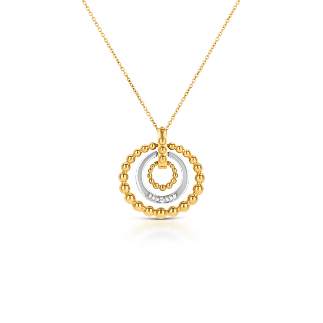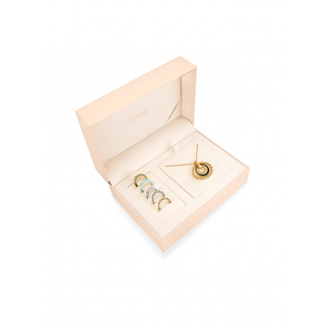 O Set Mood Elegance é a expressão perfeita de sofisticação com um toque pessoal. Composto por um colar dourado de elos finos e delicados, esta peça destaca-se pelo mosquetão central, que permite aplicar três pendentes em simultâneo, um pequeno, um médio e um de maior dimensão, criando combinações únicas e adaptadas a cada momento. Este set inclui oito pendentes distintos, desenhados para explorar ao máximo a versatilidade da peça. Entre eles, um pendente pequeno em esferas douradas e um pendente maior com o mesmo padrão, ideal para dar destaque ao centro do colar. Os seis pendentes de tamanho médio são totalmente intercambiáveis: um de esferas prateadas, outro de esferas douradas intercaladas com cristais zircónica brancos, um pendente prateado liso com um detalhe central cravado também em cristais zircónica brancos e três versões lisas com rebordo dourado: uma de fundo azul, outra de fundo preto e uma terceira em fundo verde, oferecendo subtilidade e elegância. Com o Mood Elegance, cada detalhe é pensado para dar liberdade criativa a quem o usa. Um colar transformável que se adapta ao estilo, à ocasião e à personalidade de cada mulher.