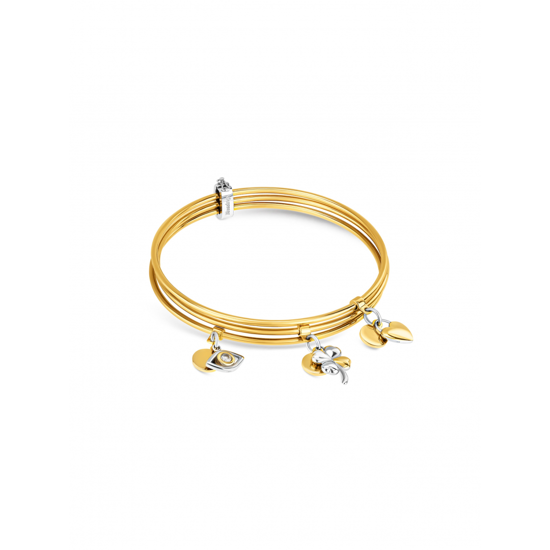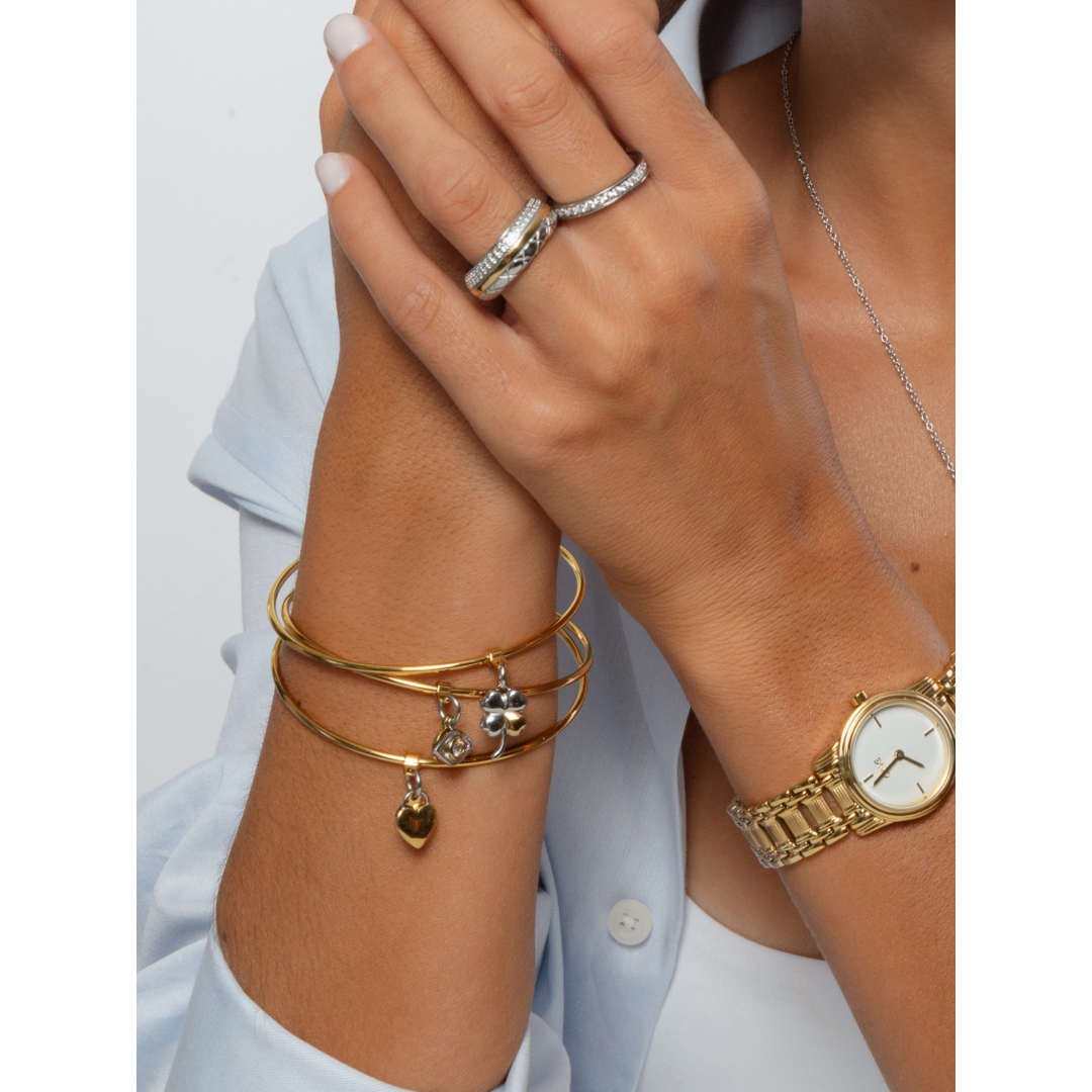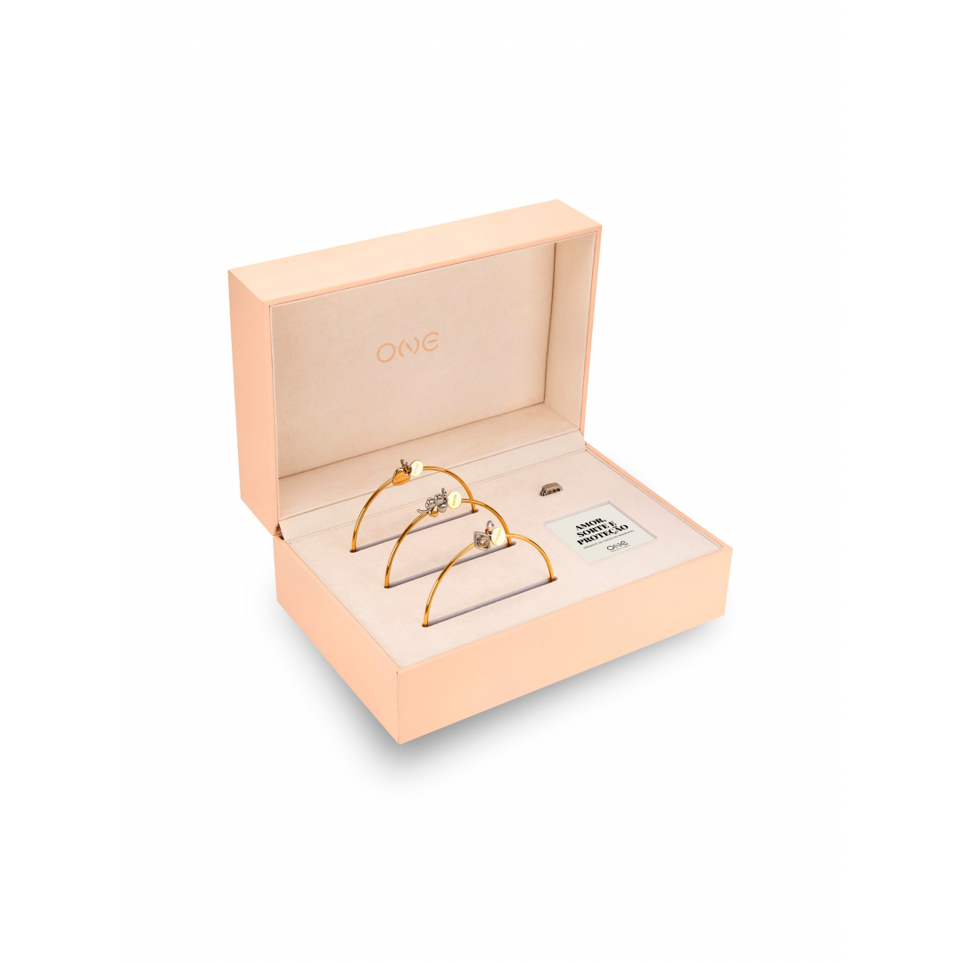 O Set Blessing Triple Light é uma celebração de significado, elegância e energia positiva. Composto por três escravas douradas fechadas, cada uma apresenta charmes fixos que simbolizam proteção, sorte e amor: o olho grego, o trevo e o coração. Os detalhes em prateado e os cristais zircónicos adicionam um brilho subtil que eleva o design, mantendo um equilíbrio entre modernidade e simbolismo. As escravas podem ser usadas individualmente, para um toque mais delicado, ou em conjunto, criando um efeito elegante e expressivo. O conjunto inclui ainda um travão prateado, que mantém as pulseiras unidas no pulso, garantindo conforto e estabilidade. Mais do que um acessório, o Set Blessing Triple Light é uma declaração de intenções, uma lembrança constante dos bons desejos e das energias positivas que nos acompanham todos os dias.