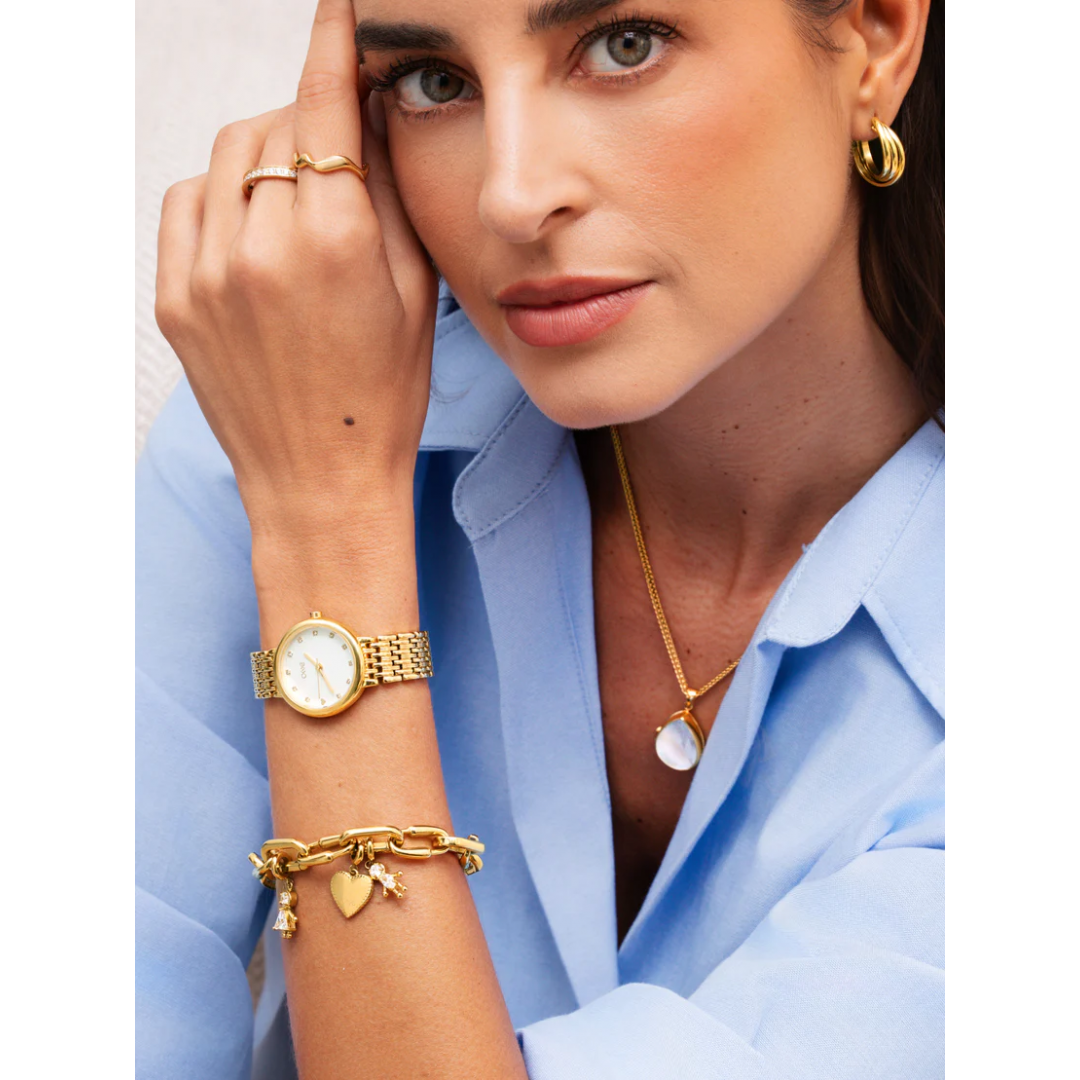 O relógio Eternal apresenta um design elegante e intemporal, totalmente em tom dourado. O mostrador de fundo claro destaca-se pelo seu acabamento uniforme, criando uma base luminosa que valoriza todos os detalhes. Os índices são marcados por cristais zircónias delicadamente cravados, distribuídos de forma equilibrada ao longo do mostrador, enquanto um índice em formato de coração acrescenta um detalhe subtil e feminino que diferencia a peça. Os ponteiros finos em dourado acompanham a estética minimalista do mostrador, mantendo a harmonia do conjunto e reforçando o carácter leve e sofisticado do relógio. A caixa de linhas suaves liga-se a uma bracelete em malha de elos trabalhados, que confere textura e sofisticação ao relógio, garantindo ao mesmo tempo conforto no pulso. O acabamento polido reforça o brilho do dourado, tornando esta peça versátil e fácil de conjugar com diferentes estilos. Ideal para quem procura um relógio feminino, elegante e intemporal, com detalhes subtis e um mostrador cuidado que faz a diferença.