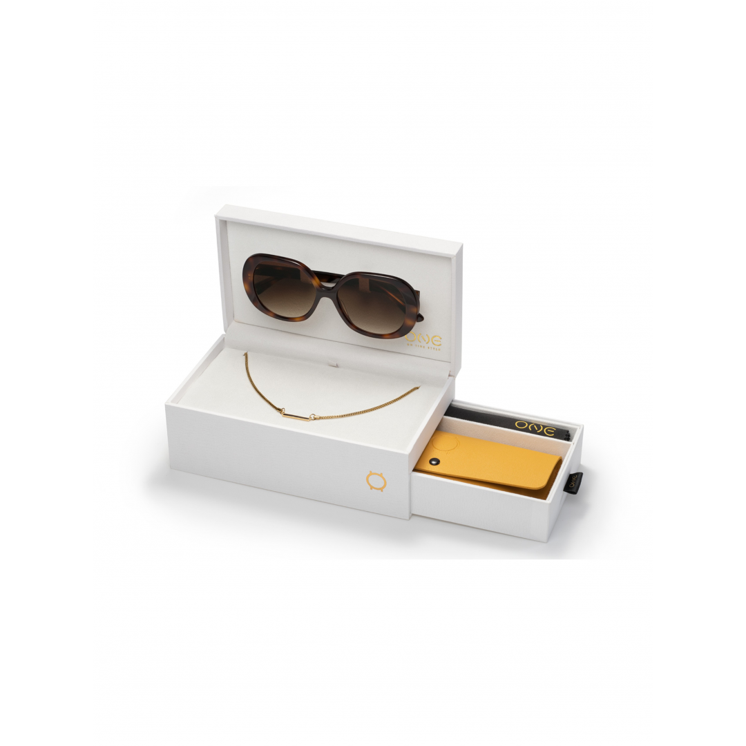 A Box Sunglasses Powerful têm como particularidade a versatilidade e multifuncionalidade dos óculos de sol, através do fio da haste que é vulgarmente utilizado para pendurar os óculos ao pescoço, mas que no caso da ONE, terá o papel de fashion statement ao assumir 3 funções: segurar os óculos, transformar-se numa jóia de costas- através do pendente presente no fio, ou ainda a possibilidade de ser simplesmente usado como um colar. Apresentamos os Powerfull, óculos de sol de formato oval, com pequenas formas rectangulares, contrastando um look contemporâneo com a intemporalidade de um retro, poderosos dada a sua armação em acetato, conferindo robustez, mas sem nunca descurar a leveza e o conforto que uns óculos devem proporcionar, na versão castanho tartaruga, lentes castanho gradiente e o logo em dourado. Os óculos de sol da ONE são de qualidade superior, de grande durabilidade, construídos e pensados especialmente para si com materiais como o acetato, altamente maleável permitindo moldar-se à cara e conferindo maior resistência à queda. As lentes foram também desenvolvidas pensando na sua saúde ocular, com índice de proteção UV elevada evitando a exposição dos olhos à radiação UV, e produzidas com um material resistente ao calor que impede que as lentes deformem ao contrário de outros materiais existentes no mercado. A alta durabilidade dos materiais dada a sua ótima construção, é acompanhado por uma garantia que atesta a qualidade dos óculos e que com certeza a deixará mais segura de si na hora de escolher qualquer um dos modelos da ONE Sunglasses.