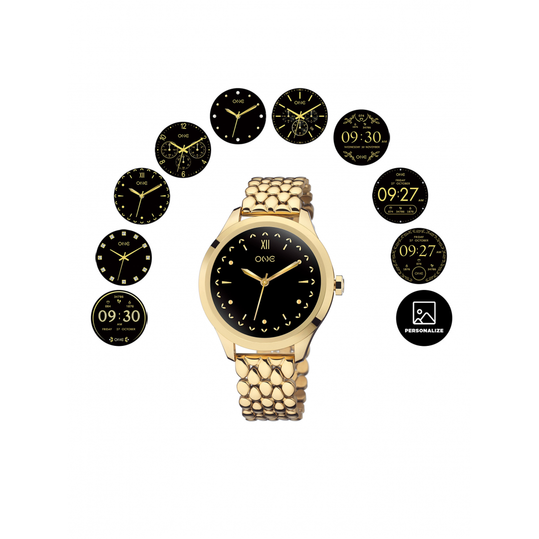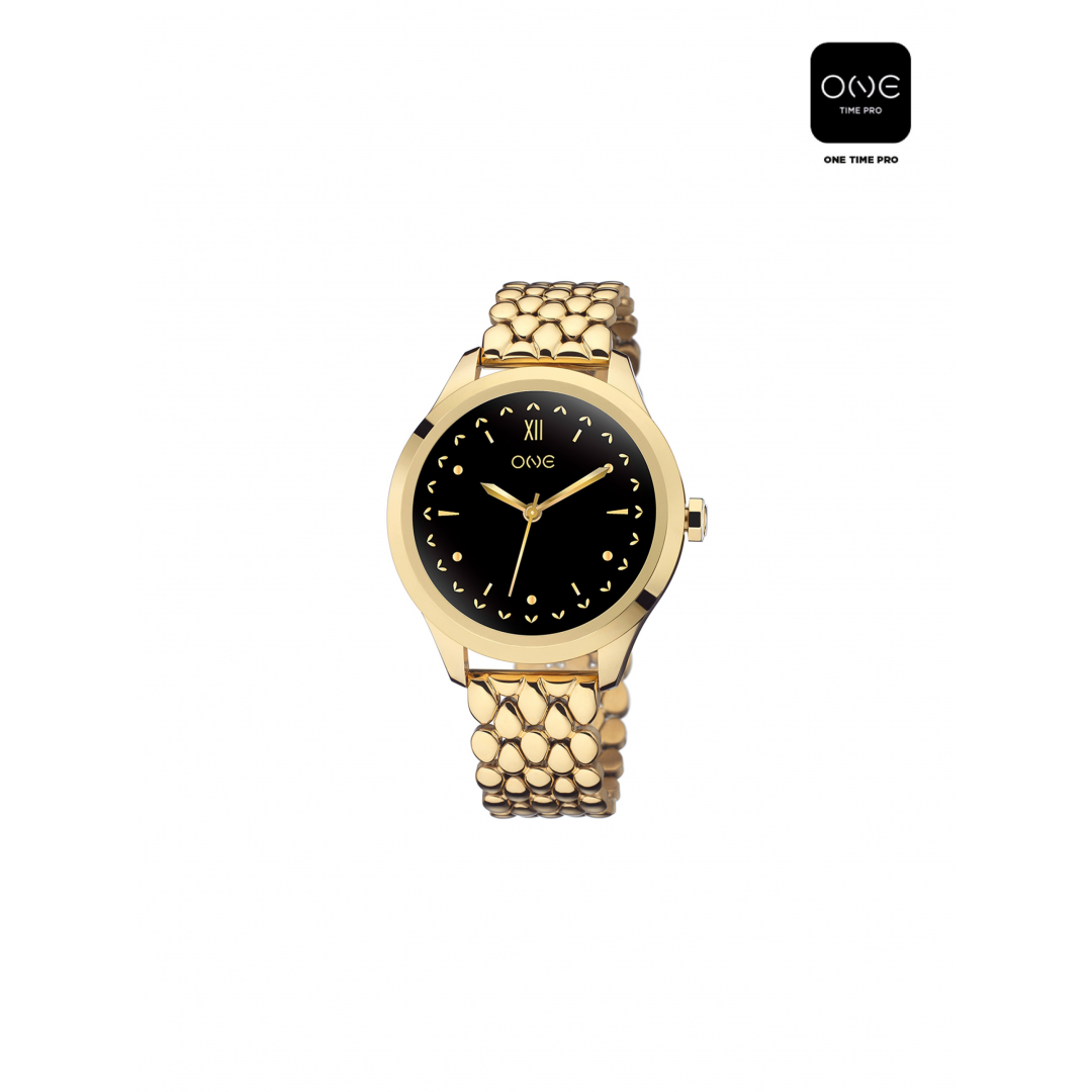 Mini Smartwatches, o tamanho importa e a elegância também. O smartwatch Mini Gold Links da geração 3 conta com uma bracelete metálica em aço inoxidável dourado, com um design de elos arredondados e textura sofisticada, criando um visual elegante e distinto. Um dispositivo tecnológico sofisticado que combina estilo e funcionalidade. O ecrã AMOLED oferece uma visualização nítida, vibrante e fluida, garantindo uma experiência visual premium. O mostrador é totalmente personalizável, com 10 designs exclusivos com o ADN One, ou podes optar por utilizar qualquer imagem da galeria do teu telemóvel para um toque ainda mais pessoal. Compatível com a aplicação One Time Pro, o Mini Gold Links permite-te manter o controlo da tua rotina com funcionalidades como chamadas via Bluetooth, notificações, controlo de música, medição de saúde e muito mais, tudo com um simples toque no pulso. Este modelo não é compatível com braceletes avulsas à venda no site. Para quem procura um smartwatch com funcionalidade, conectividade e estilo num formato mini, o Mini Gold é a escolha ideal.