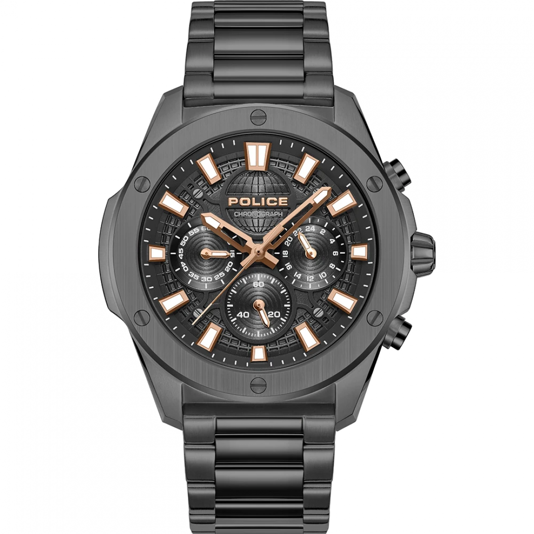 O Moonstrike emerge das sombras com força. O relógio apresenta um mostrador preto profundo com marcantes índices em bronze e submostradores de cronógrafo complexos, proporcionando profundidade e energia mecânica bruta. A caixa imponente de aço inoxidável de 43×50,5 mm com revestimento iônico em tom de grafite combina bordas polidas com superfícies escovadas, conferindo ao relógio uma silhueta urbana e robusta. Equipado com um confiável movimento de cronógrafo de duplo fuso horário e complementado por uma pulseira resistente de aço inoxidável polido em tom de grafite, o Moonstrike personifica a energia da POLICE em toda a sua potência.