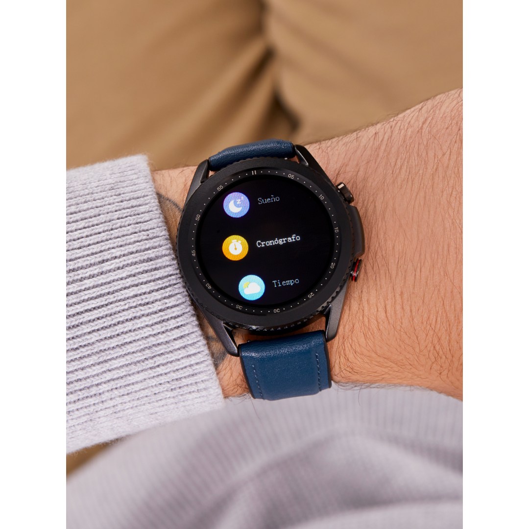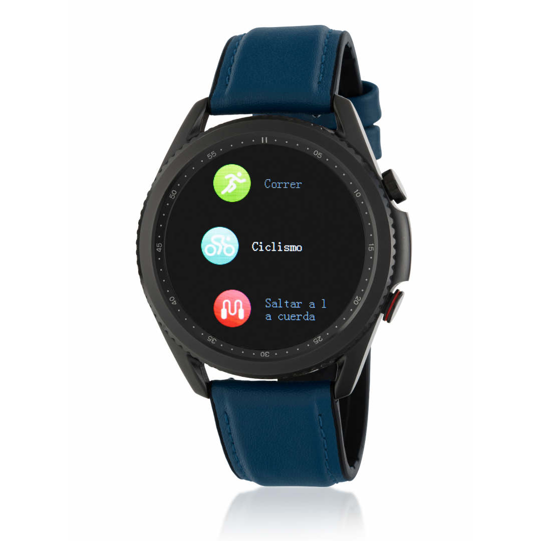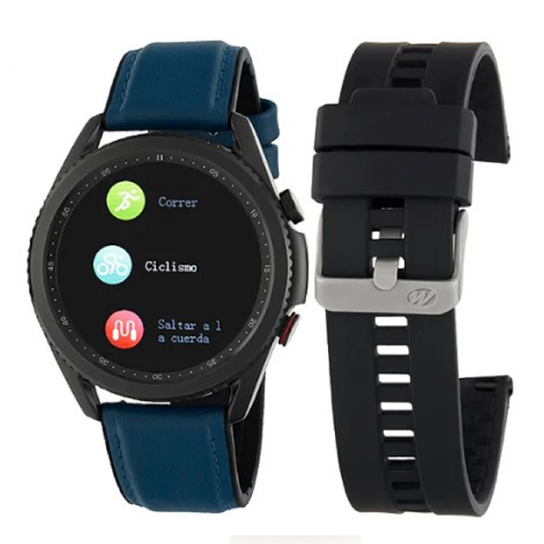 Marea Smartwatch B57011 / 1 Preto. Caixa de aço preta. Bracelete de couro preta com bracelete de silicone azul. Tamanho 47X12,5 mm. Função Smartwatch. Calorias consumidas. Distância percorrida. Degraus. Defina a meta da etapa. Não incomodar. Monitoramento do sono. Frequência cardíaca. Teste automático de RH. Pressão sanguínea. Oxigênio no sangue. Fale via bluetooth. Modo esporte. Lembrete sedentário. Notificações de chamadas. Notificações RRSS. Notificações de mensagens. Leia as mensagens recebidas. Alarmes Cronógrafo. Clima. Música de controle remoto. Controle remoto da câmera. Escolha a tela inicial. Personalize a tela inicial. Anti-perda. Encontre o relógio. Ligue a tela girando o pulso. Vida útil da bateria de até 6 dias em uso normal. À prova d'água. 2 anos de garantia. Ref. B57011 / 1