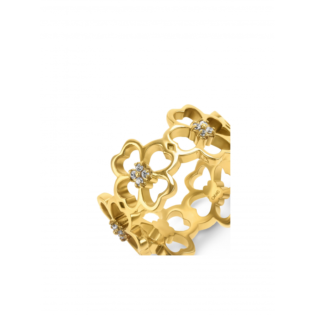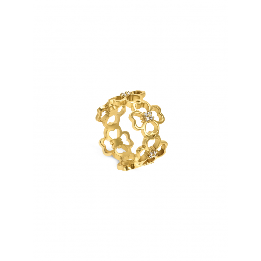 O anel dourado da coleção Bliss caracteriza-se pela sua forma em banda composta por vários trevos de quatro folhas recortados e unidos por uma das folhas. Cada um dos trevos conta com quatro pequenos cristais cravados no seu centro, dando ao anel um toque extra de brilho. A coleção Bliss celebra o emblemático símbolo da sorte, o trevo de quatro folhas, numa versão moderna e elegante.
