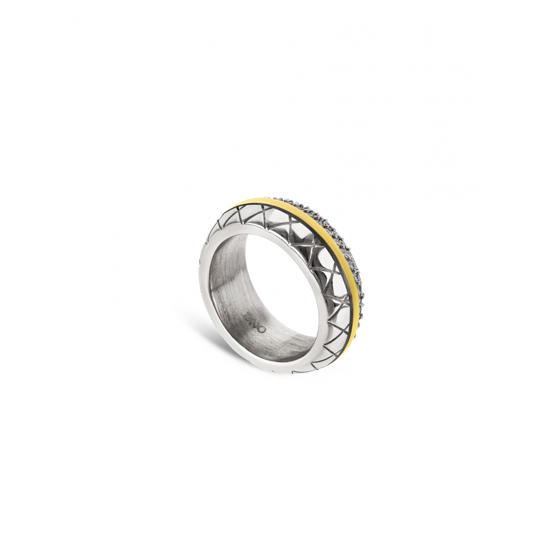 O anel da coleção Delight combina numa só peça todos os principais elementos desta coleção: mixed metals e mixed textures. Um anel em banda com um design mais "bold" que pode perfeitamente ser utilizado de forma individual para ganhar ainda mais destaque. É maioritariamente prateado, com um elemento dourado central em todo o seu torno que separa um lado totalmente cravado com cristais brancos de outro com um padrão geométrico característico da coleção.