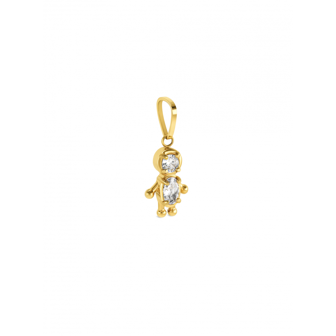 Charme com a forma de um menino, totalmente em dourado com duas zircónias brancas, uma redonda na cabeça e uma retangular no corpo do menino. Os charmes da coleção Energy for Life dão-te a possibilidade de contares a tua história de forma totalmente personalizada. Uma memória, um momento inesquecível eternizado ao pescoço ou pulso. Compatível com todos os masters da coleção Energy for Life (colares, pulseiras e escravas com fecho).